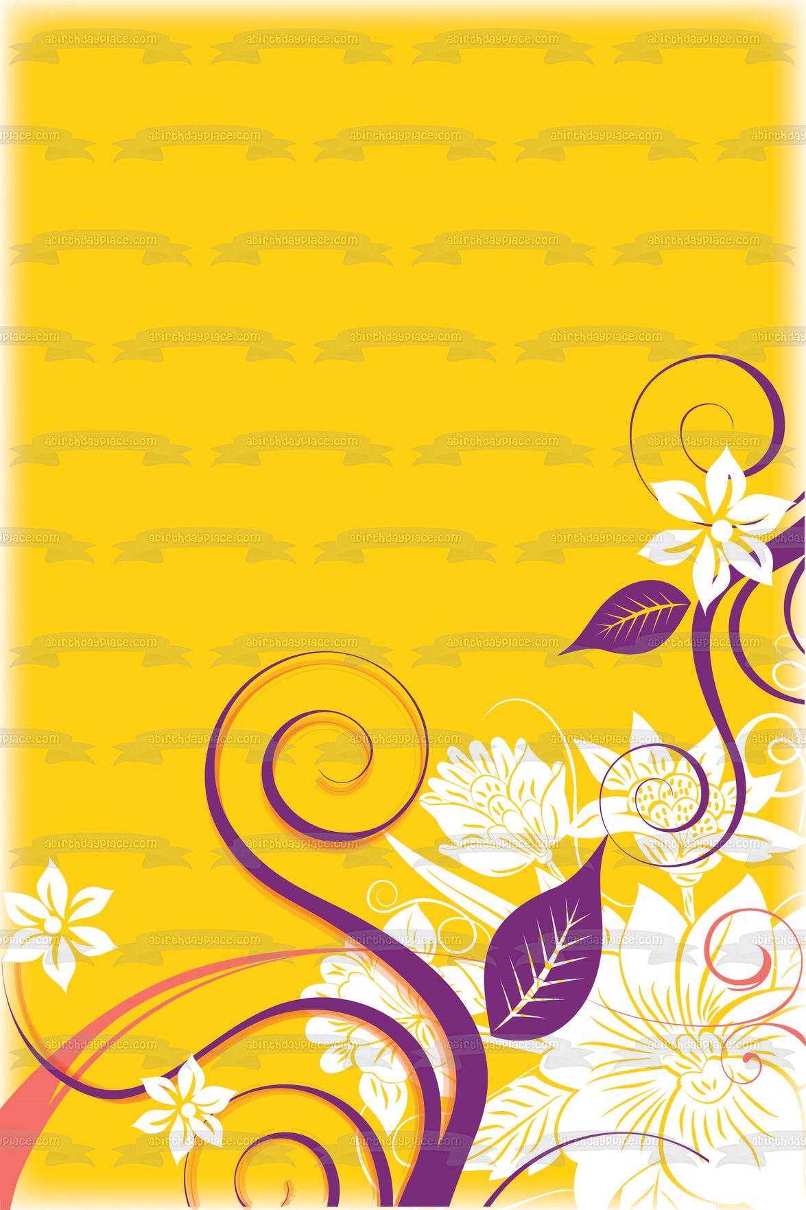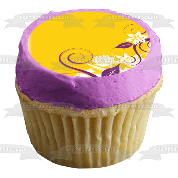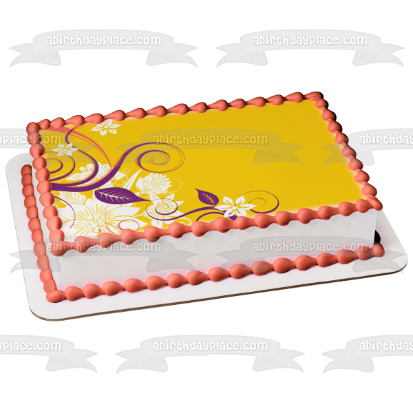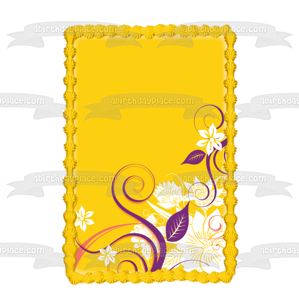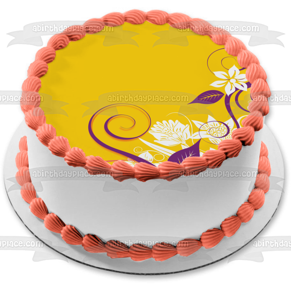 Decorate your Cake with this White Flowers and Purple Leaves Pattern themed Edible Cake Topper Image featuring a Yellow Background!