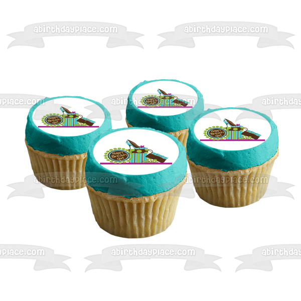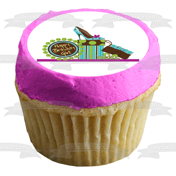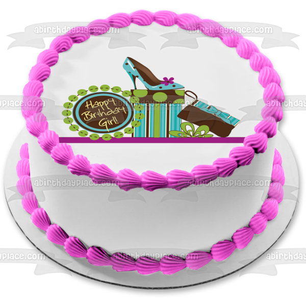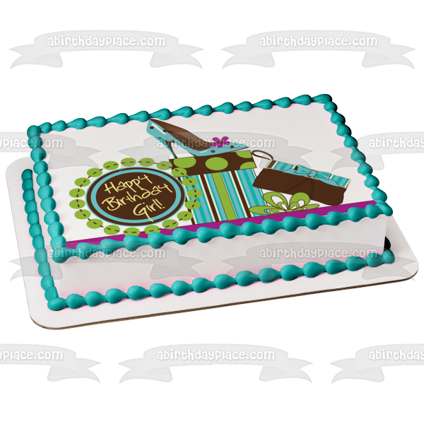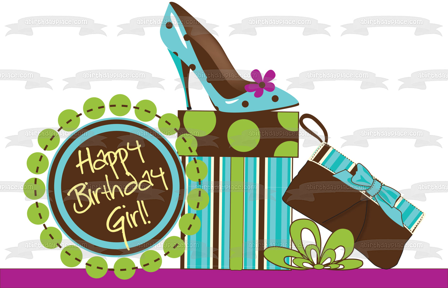 Decorate your Cake with this Happy Birthday Girl themed Edible Cake Topper Image featuring Blue, Green and Brown Presents, a Wallet and a High Heel Shoe!