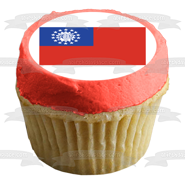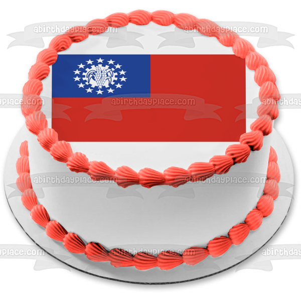Decorate your Cake with this Flag of Myanmar themed Edible Cake Topper Image featuring the Red, White and Blue colors,t he three colors of the stripes are meant to symbolize solidarity, peace and tranquility, decisiveness and courage!