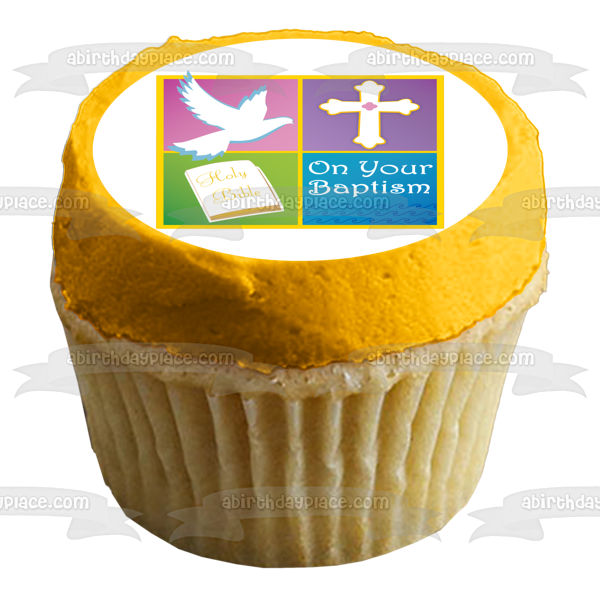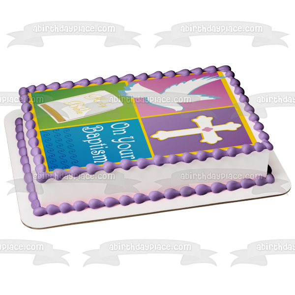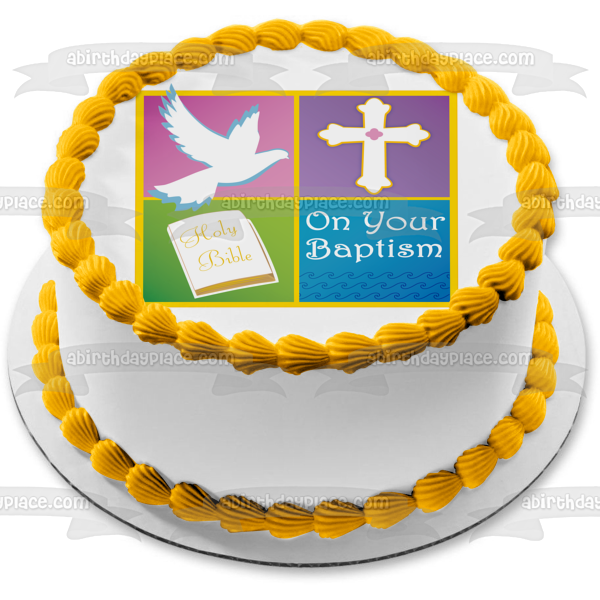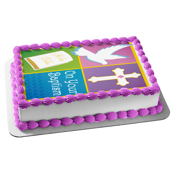 Decorate your Cake with this Baptism themed Edible Cake Topper Image featuring a Dove, a Cross and the Holy Bible!