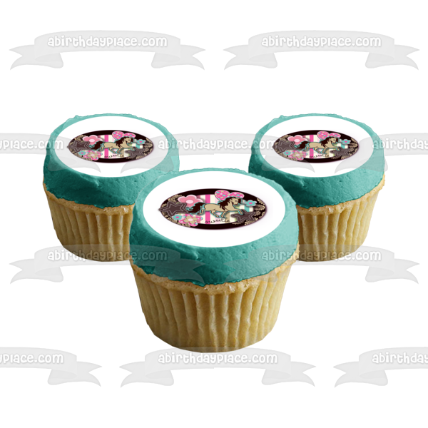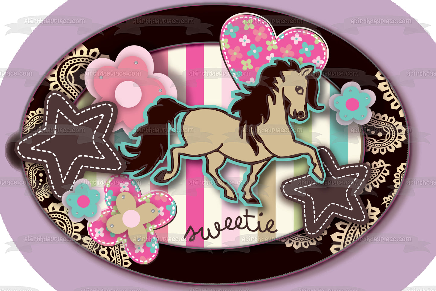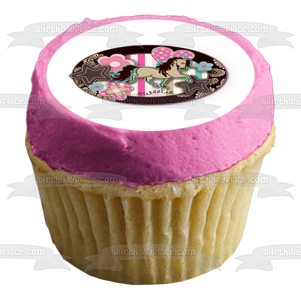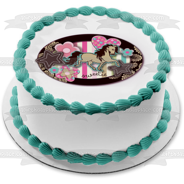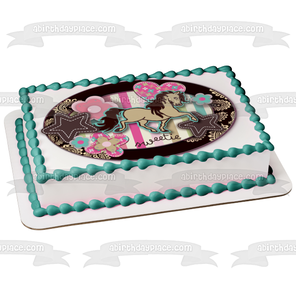 Decorate your Cake with this Sweetie Girl themed Edible Cake Topper Image featuring Hearts, Flowers, Stars and a Horse!