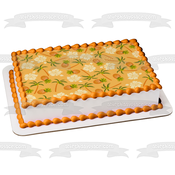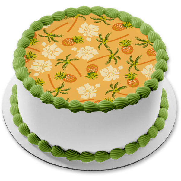Decorate your Cake with this Hawaiian themed Edible Cake Topper Image featuring Pineapples, Flowers and Palm Trees!