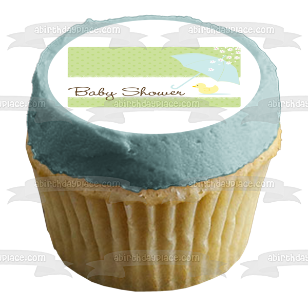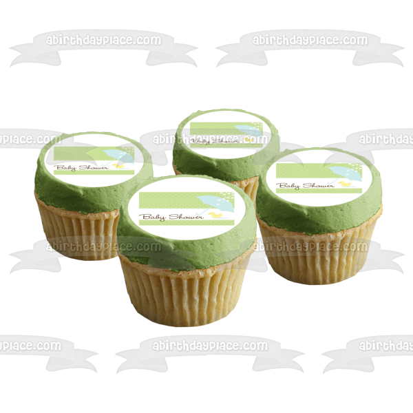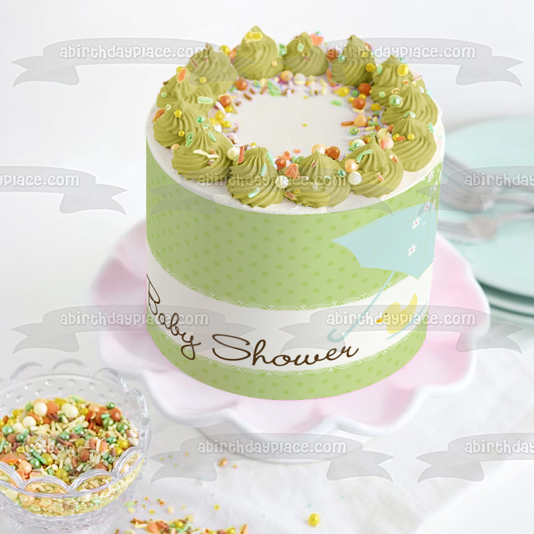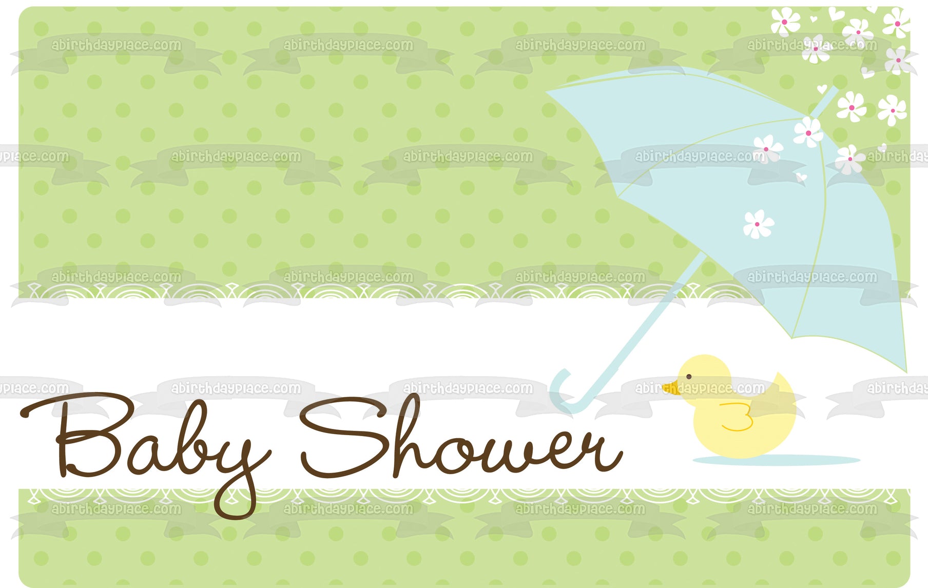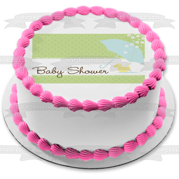 Decorate your Cake with this Baby Shower themed Edible Cake Topper Image featuring a Blue Umbrella, Pink Baby Duck, White Flowers and a Green Polka Dot Background!