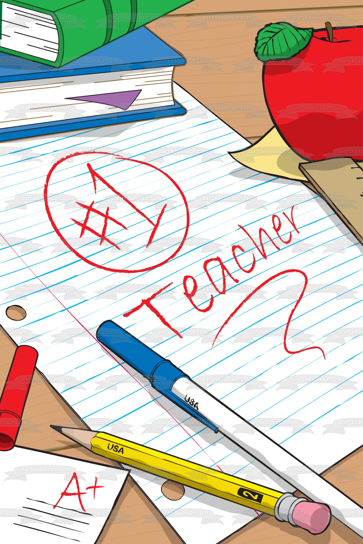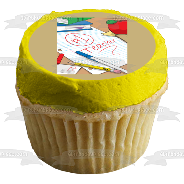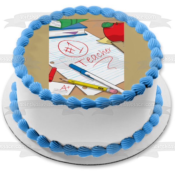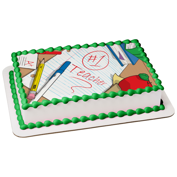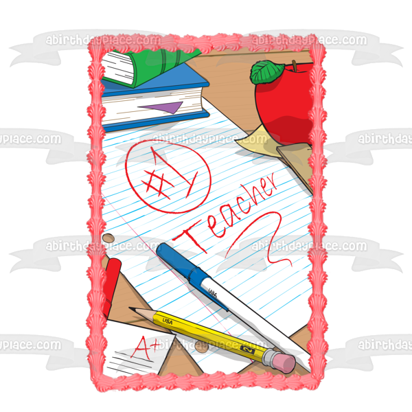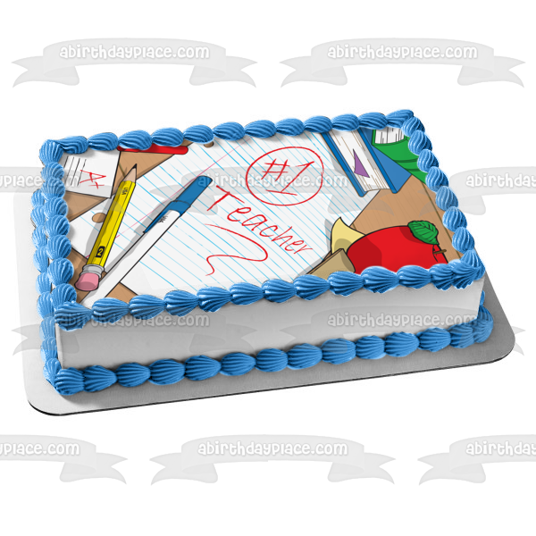 Decorate your Cake with this School #1 Teacher themed Edible Cake Topper Image featuring Books, an Apple, Pens and Pencils!