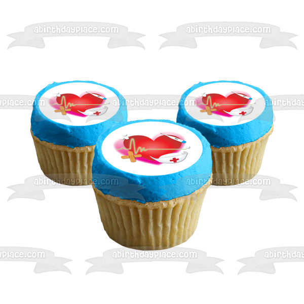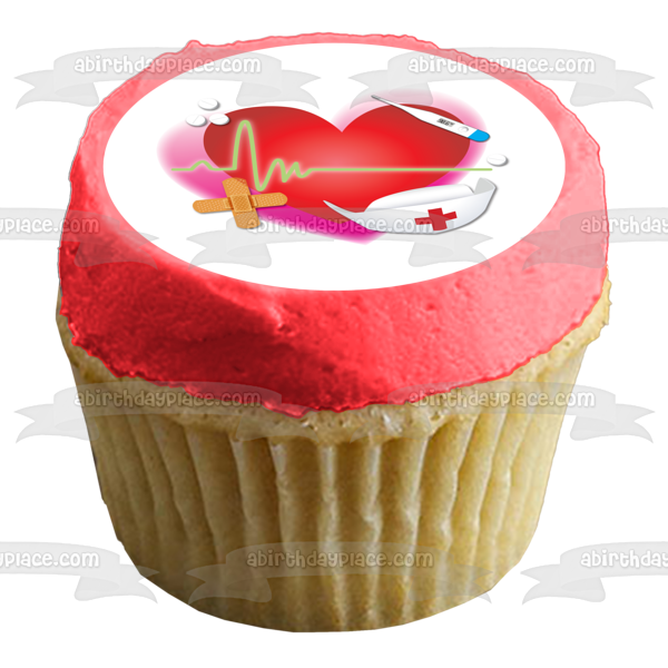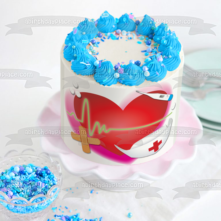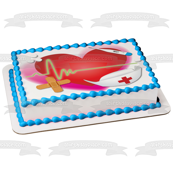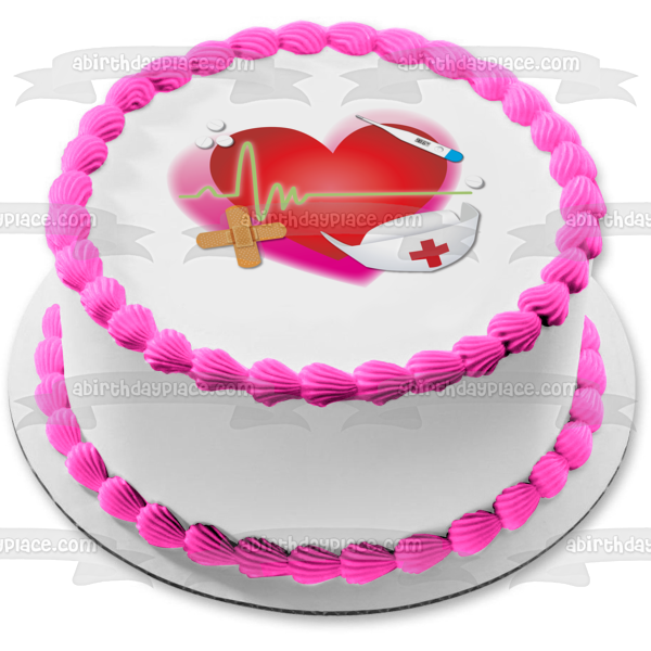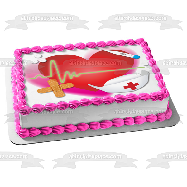 Decorate your Cake with this Nurse themed Edible Cake Topper Image featuring a Nurse Hat, Thermometer, Band-Aids, Medicine and a Heart!