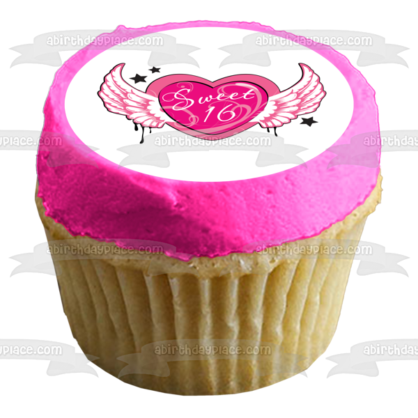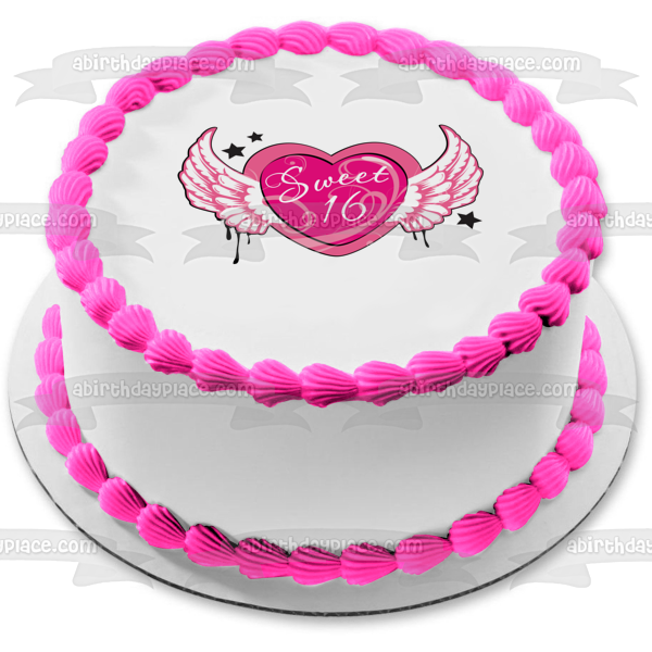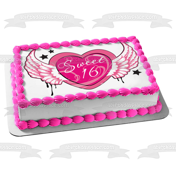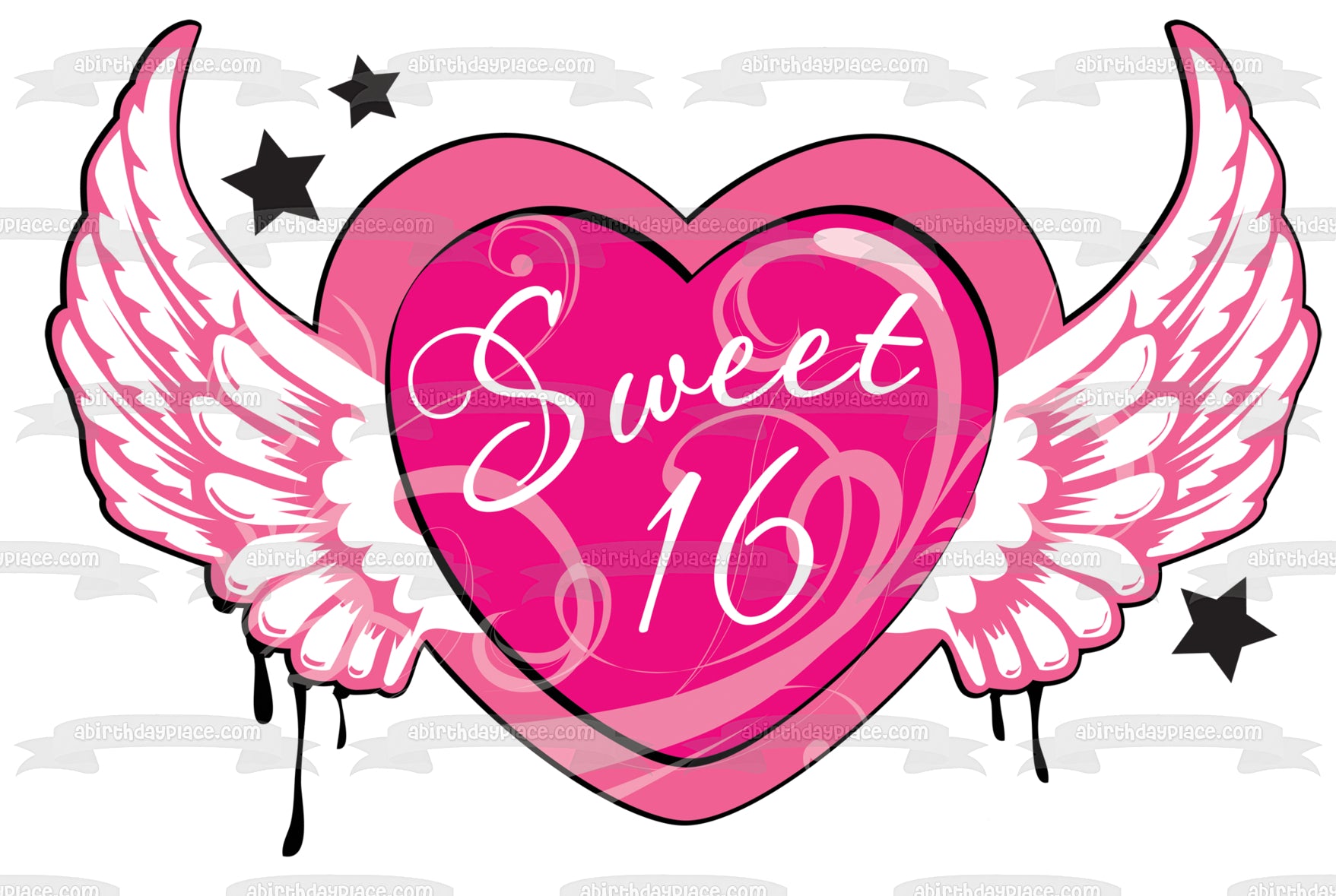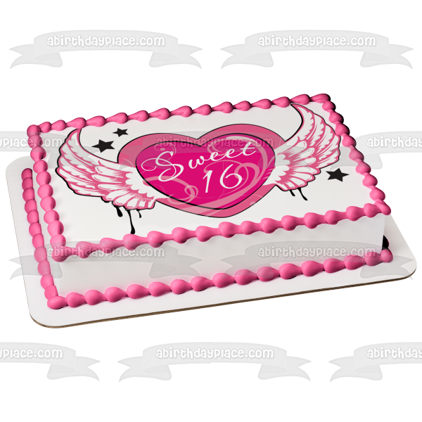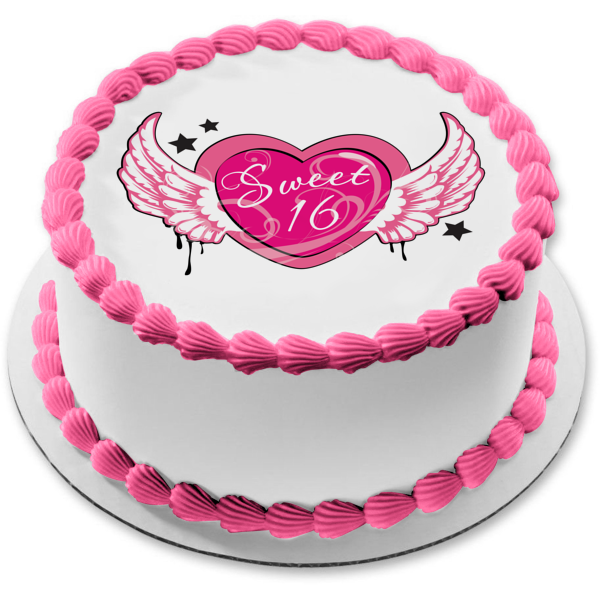Decorate your Cake with this Sweet 16 themed Edible Cake Topper Image featuring a Pink Heart with Wings and Stars!