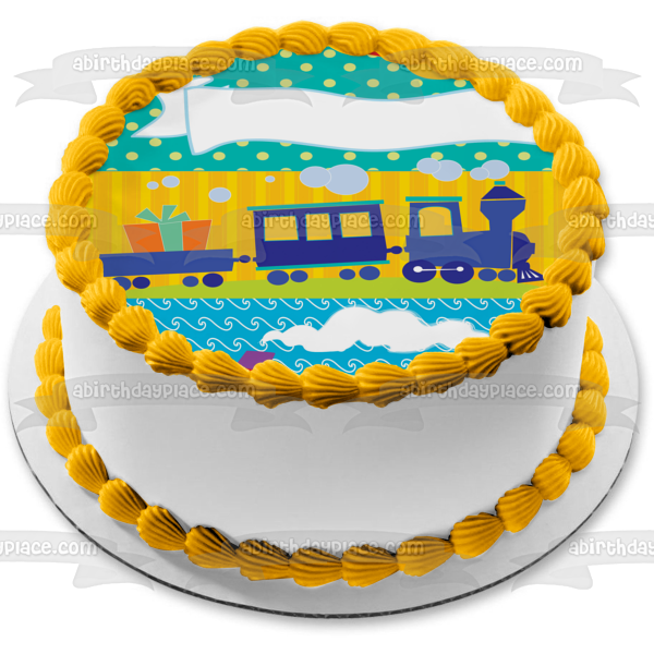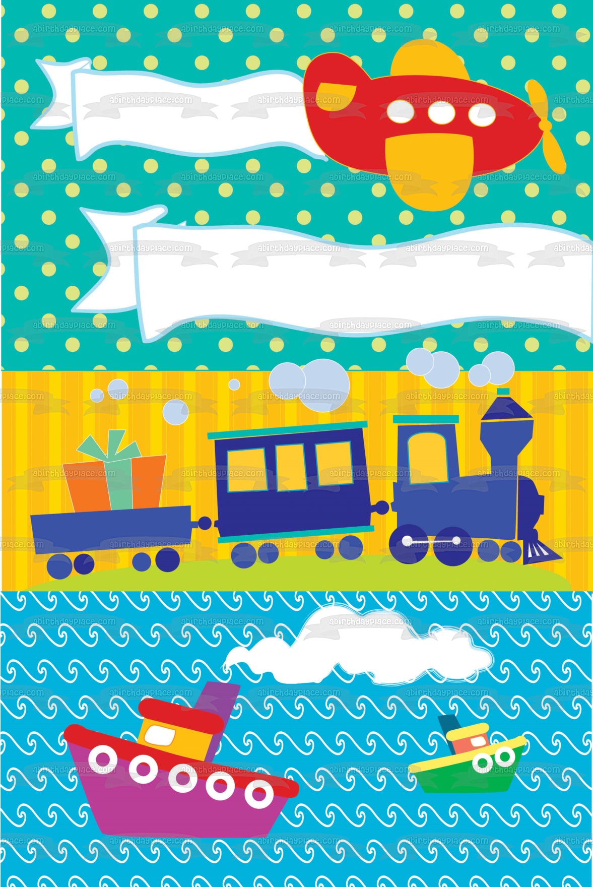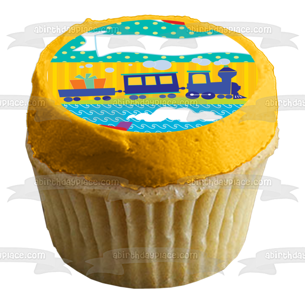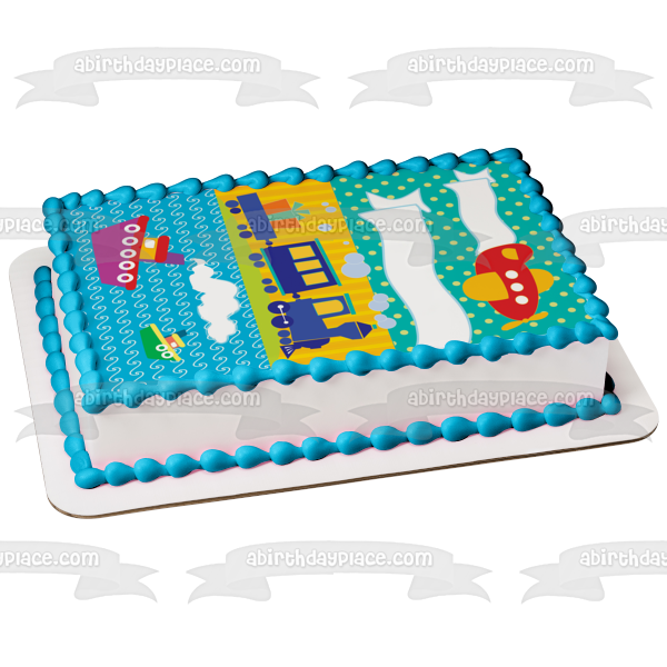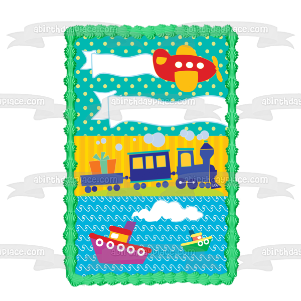 Decorate your Cake with this Happy Birthday themed Edible Cake Topper Image featuring a Cartoon Airplane, Trains, Boats and Presents!