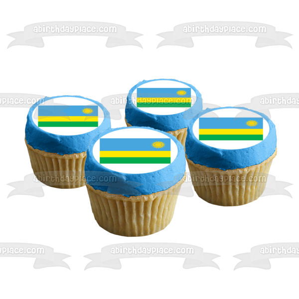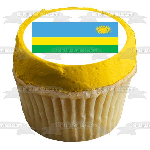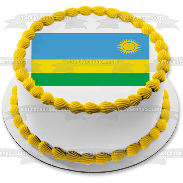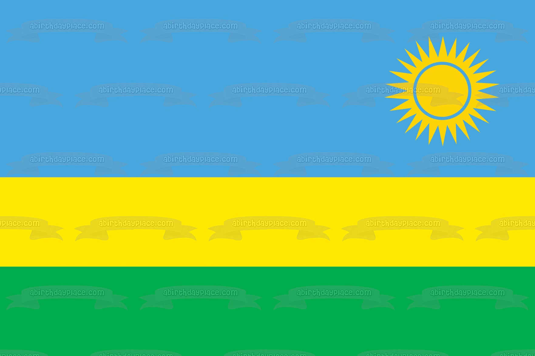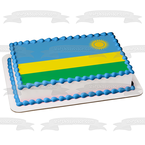 Decorate your Cake with this Flag of Rwanda themed Edible Cake Topper Image featuring the Blue Band symbolizes Peace and Happiness, the Yellow Band symbolizes Economic Development, the Green Band symbolizes the Hope of Prosperity and the Sun symbolizes Enlightenment!