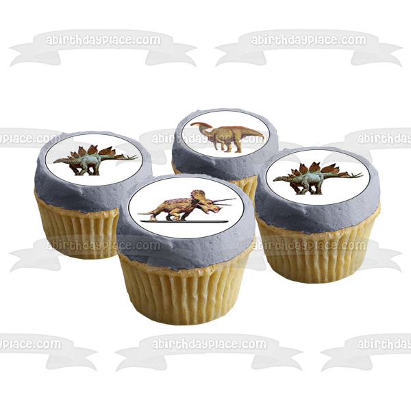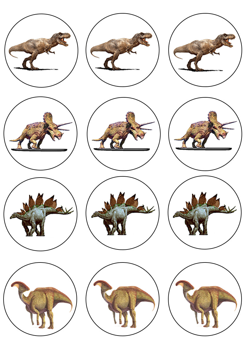 Decorate your Cupcakes with these Dinosaurs themed Edible Cupcake Topper Images featuring Tyrannosaurus Rex, Triceratops and Stegosaurus!