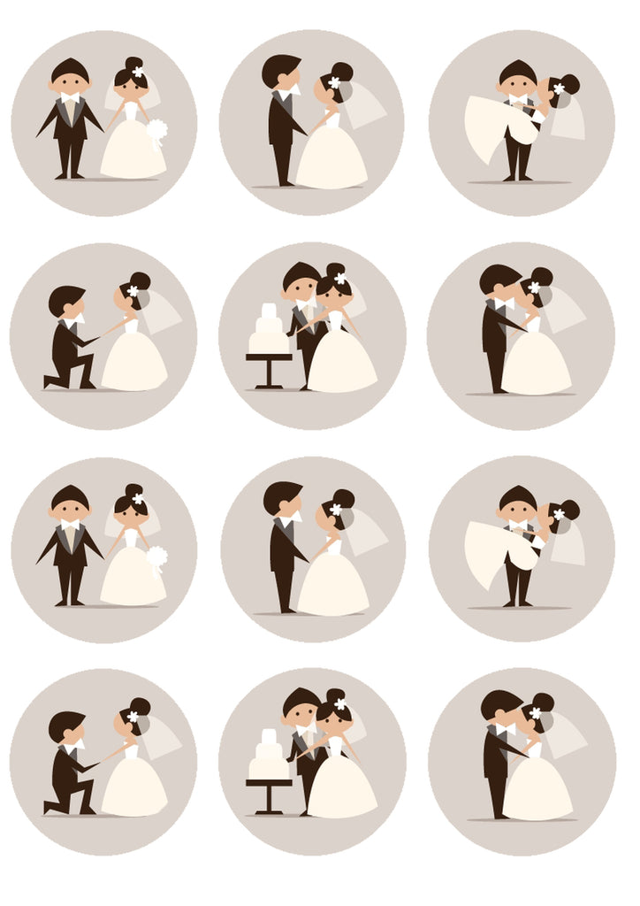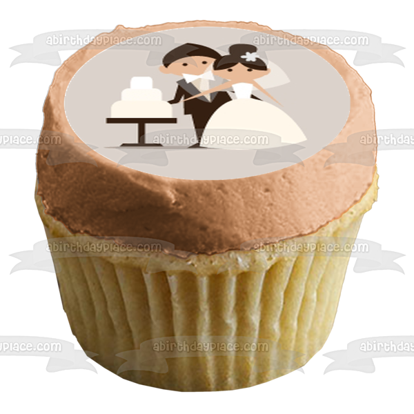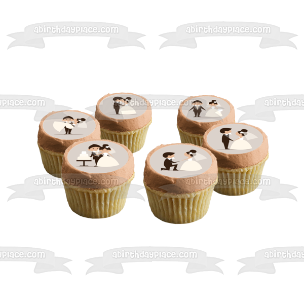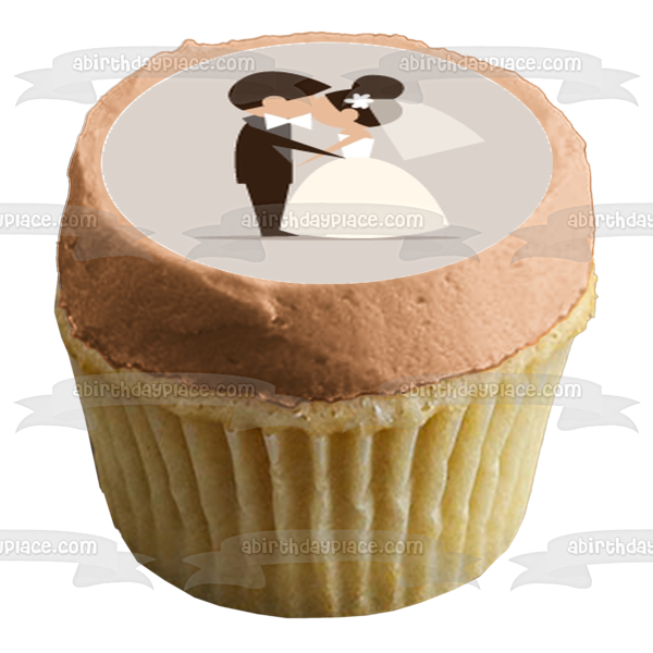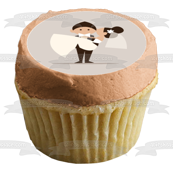 Decorate your Cupcakes with these Wedding themed Edible Cupcake Topper Images featuring a Bride and Groom with the Groom Holding the Bride, them Kissing and Cutting the Cake!