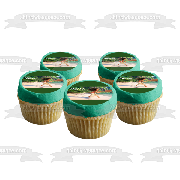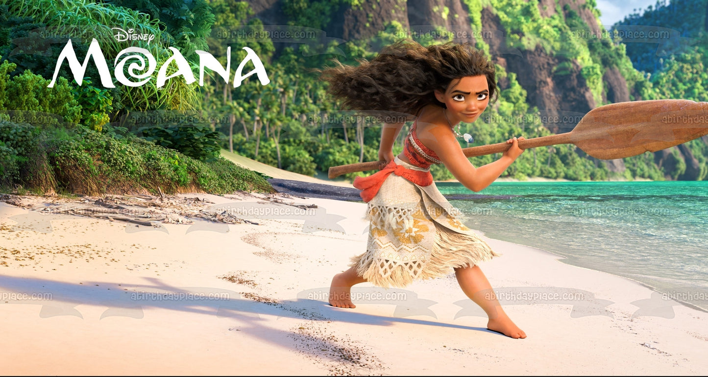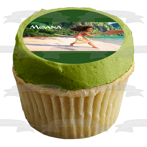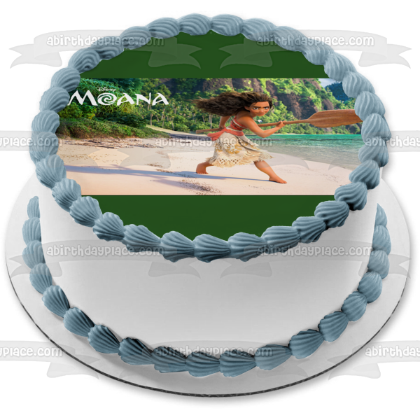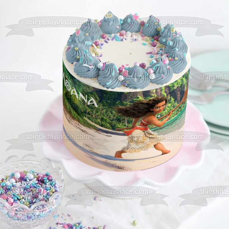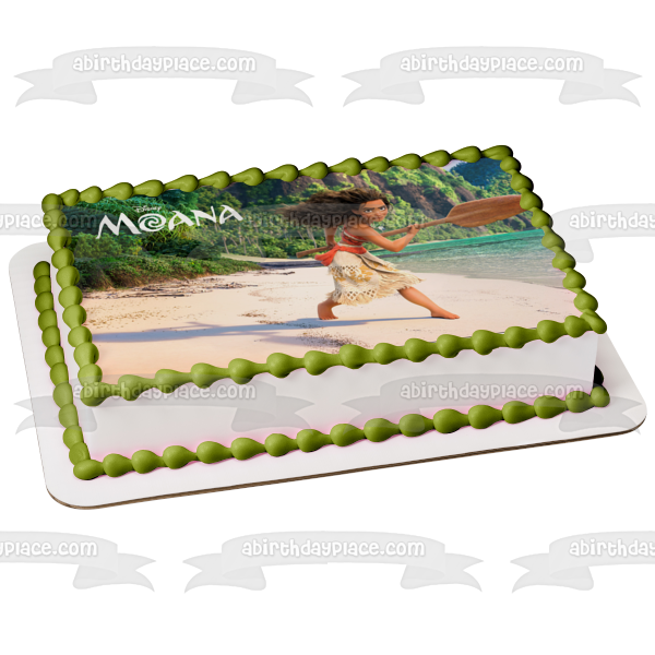 Decorate your Cake with this Disney Moana themed Edible Cake Topper Image featuring Moana on the Beach surrounded by Mountains!