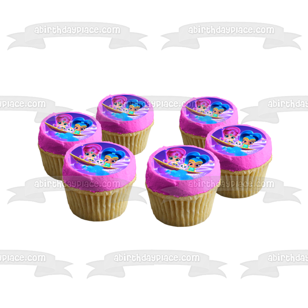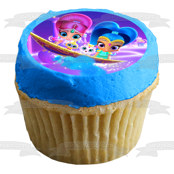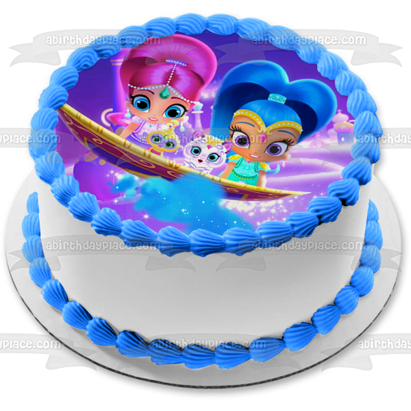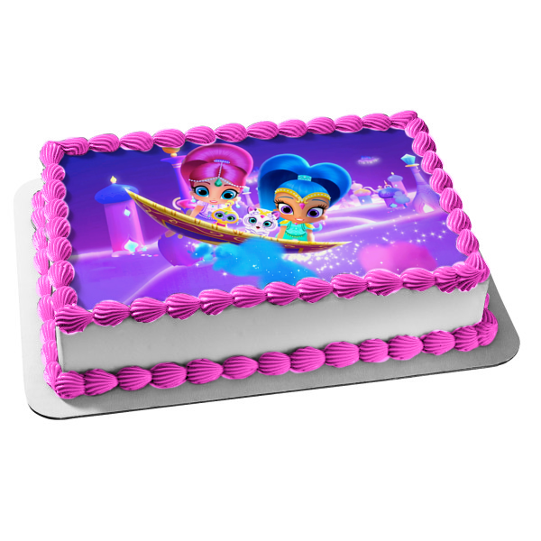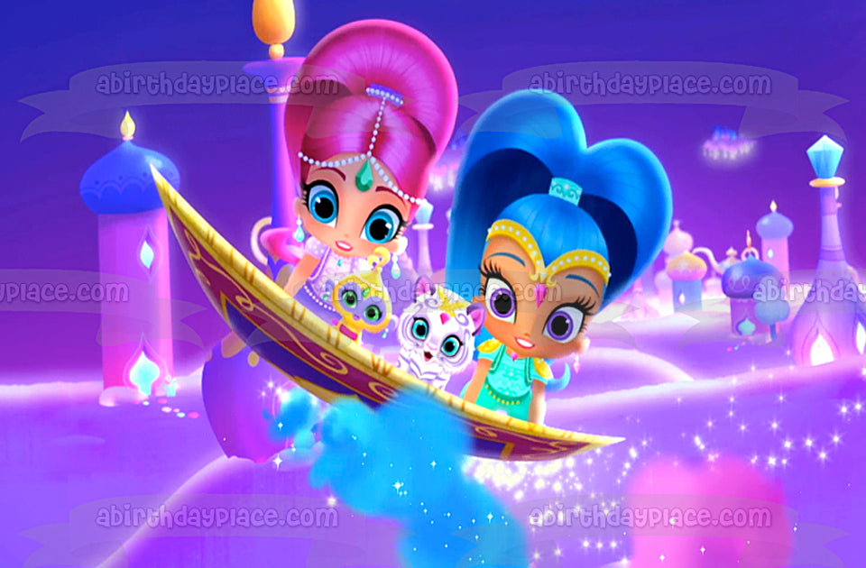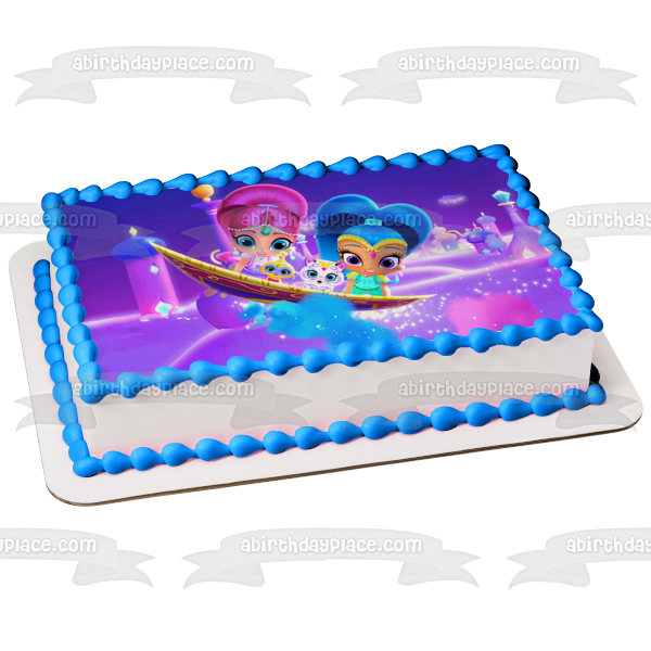 Decorate your Cake with this Shimmer and Shine themed Edible Cake Topper Image featuring them and their Pets Riding a Magic Flying Carpet with Castles in the Background!
