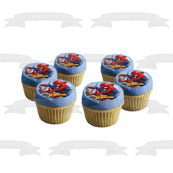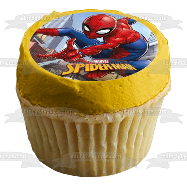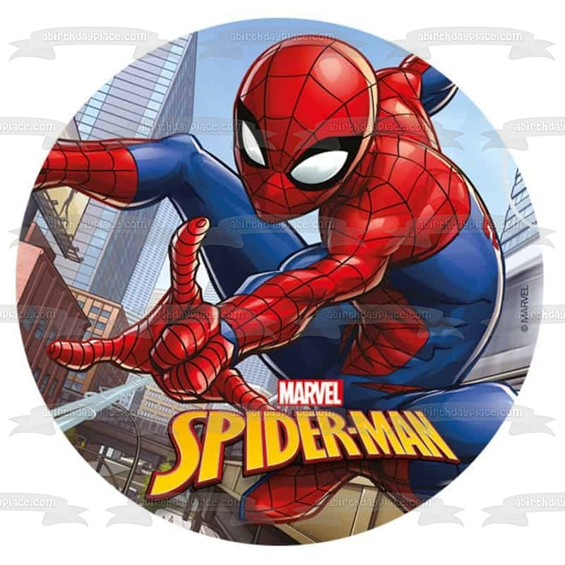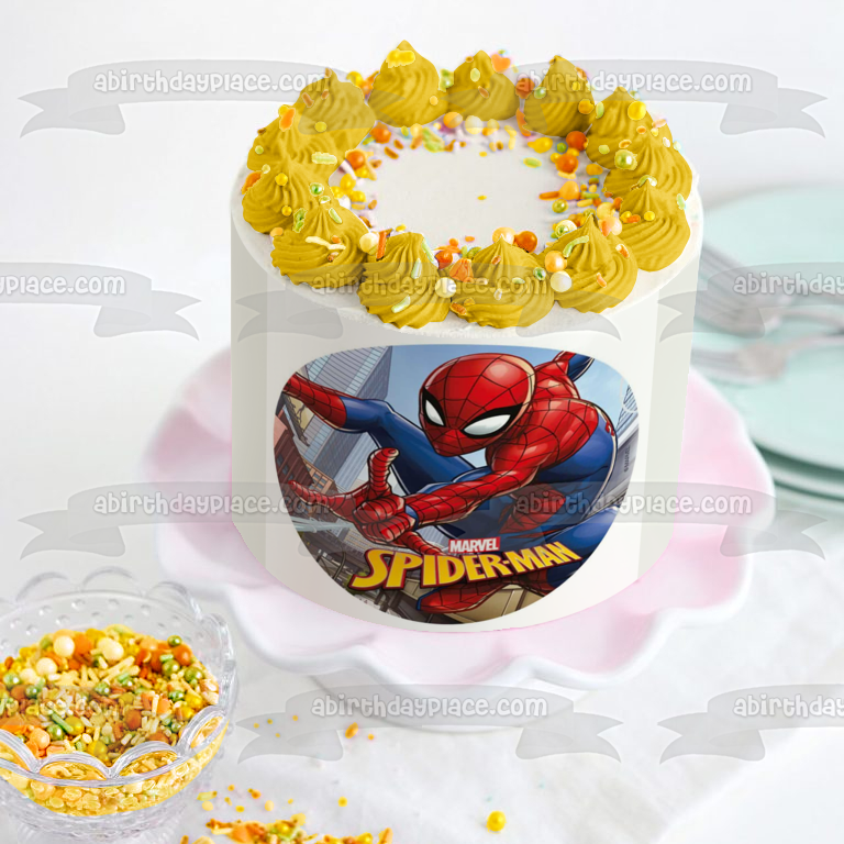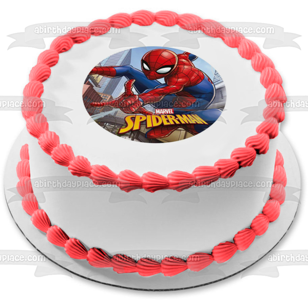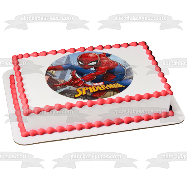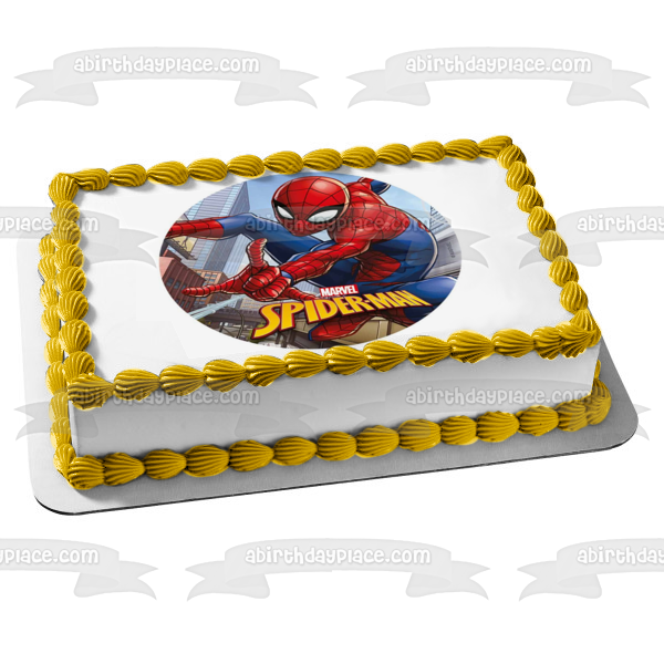 Decorate your Cake with this Marvel themed Edible Cake Topper Image featuring Spider-Man Shooting Webs and Buildings in the Background!