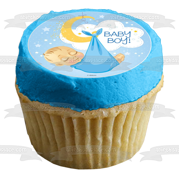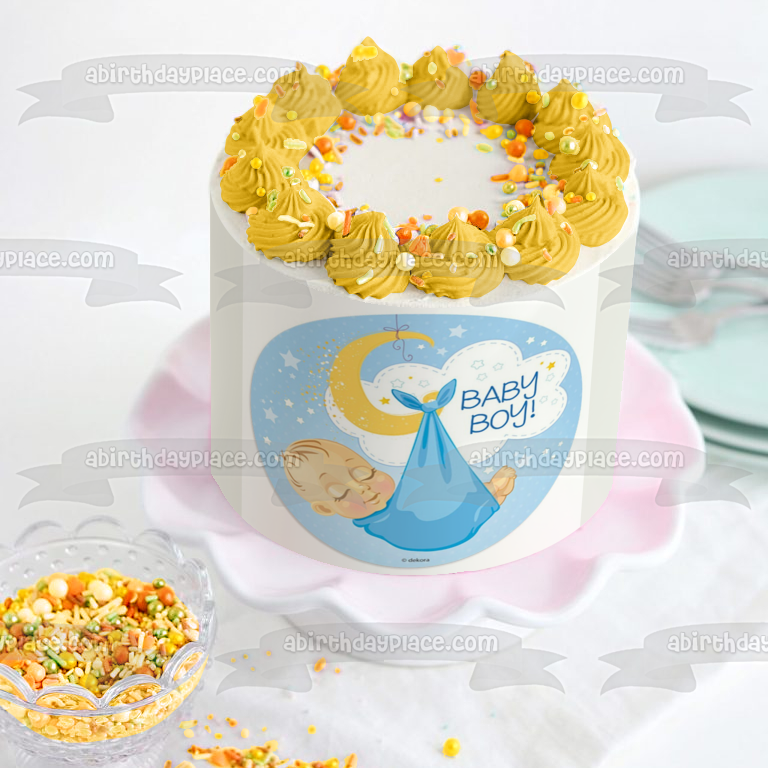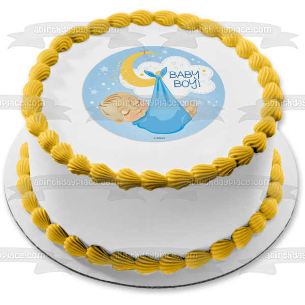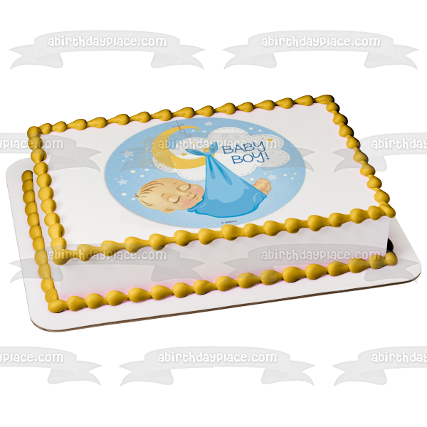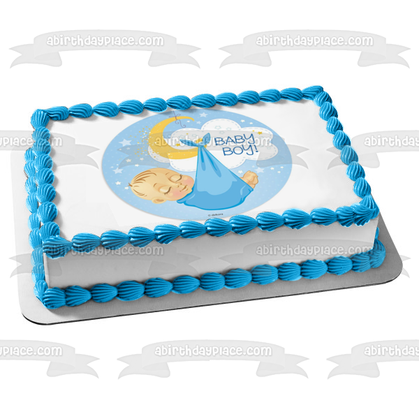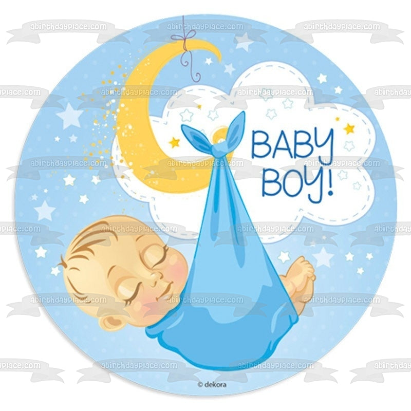 Decorate your Cake with this Baby Shower themed Edible Cake Topper Image featuring a Baby Boy in a Blue Blanket hanging from the Moon with Clouds and Stars!