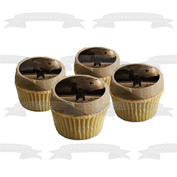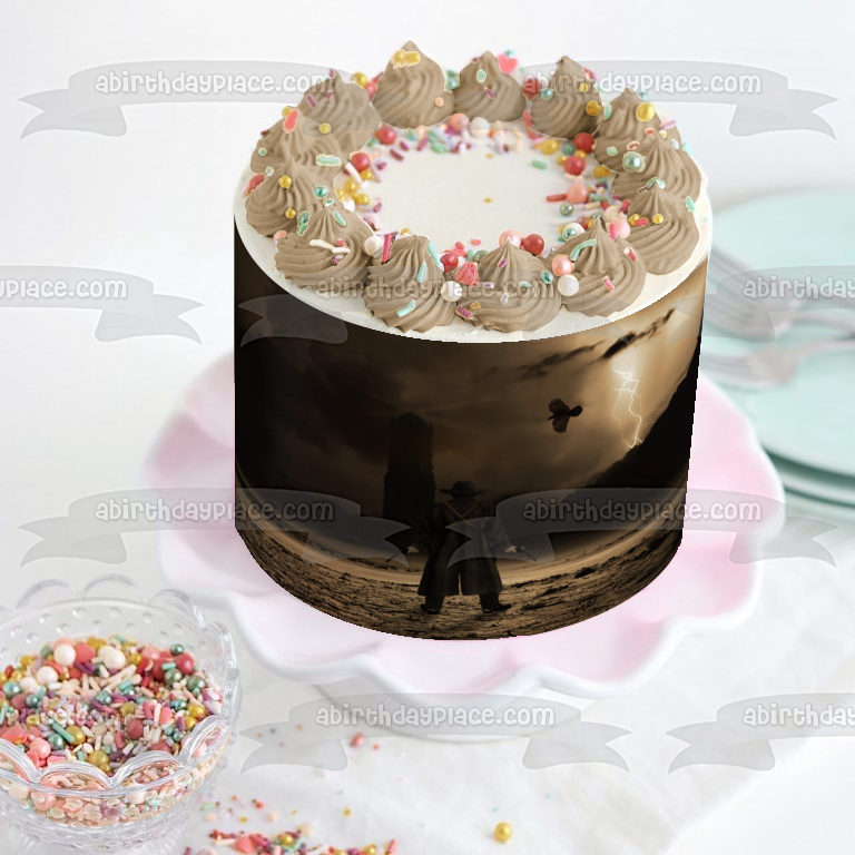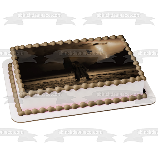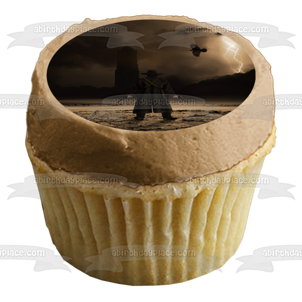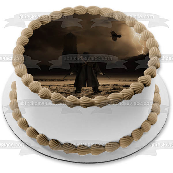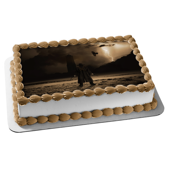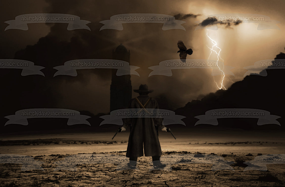 Decorate your Cake with this The Dark Tower: Gunslinger themed Edible Cake Topper Image featuring Gunslinger looking at the Dark Tower a Grey Sky Background and a Bird Flying past Lightening!