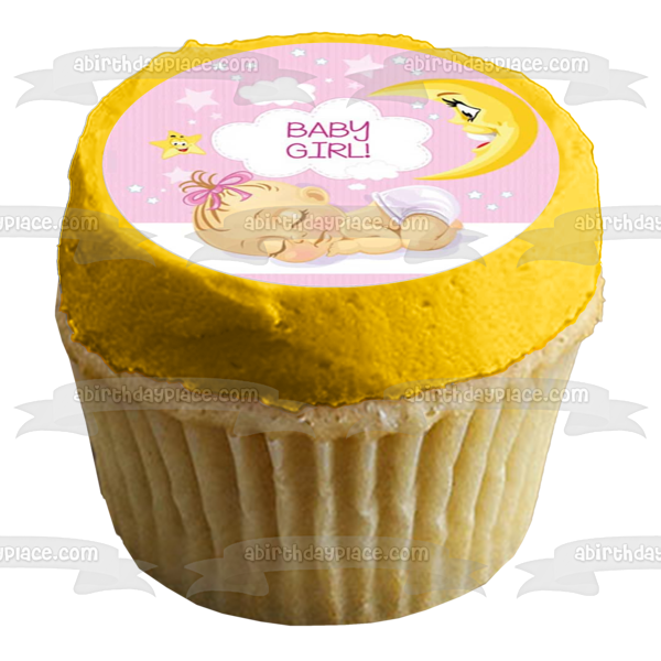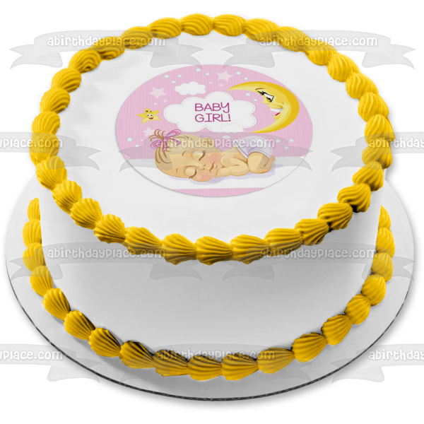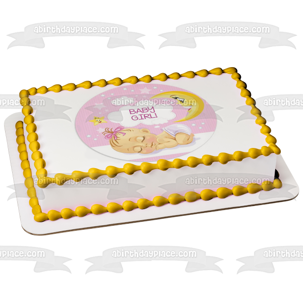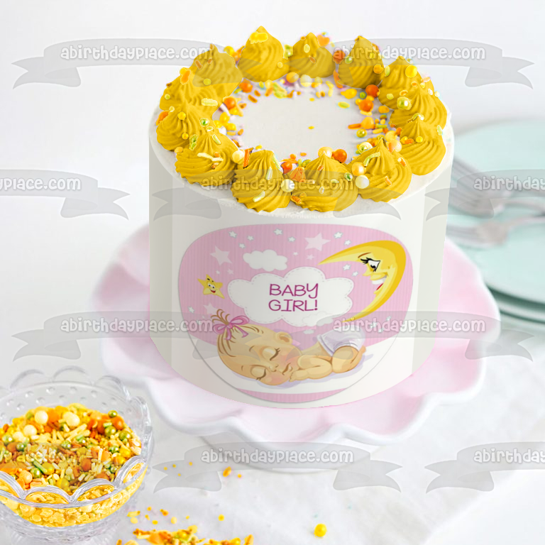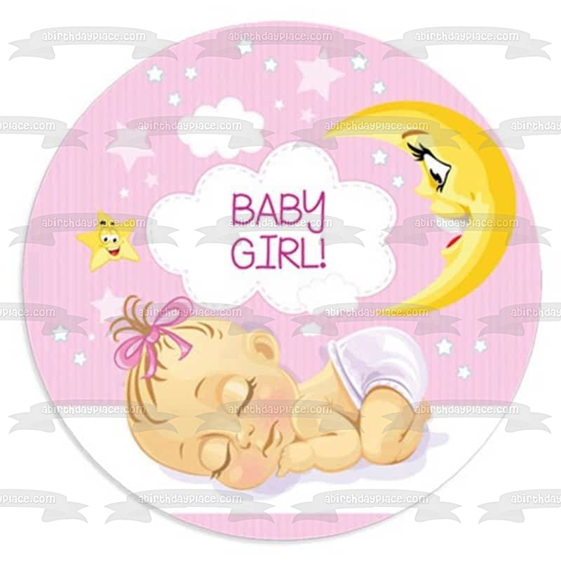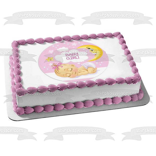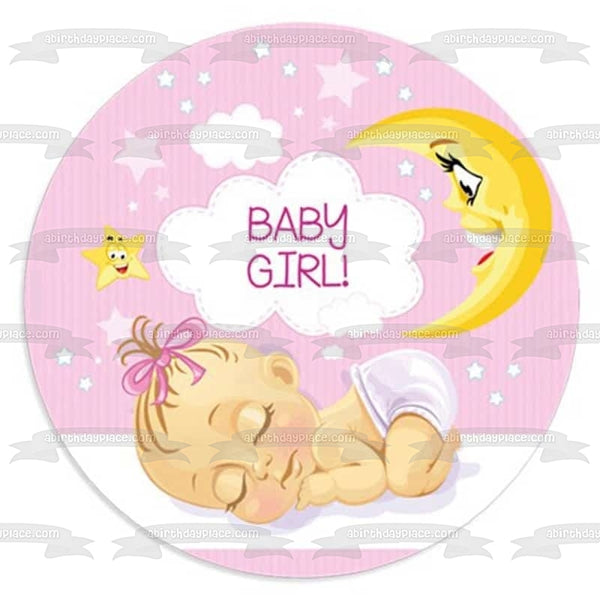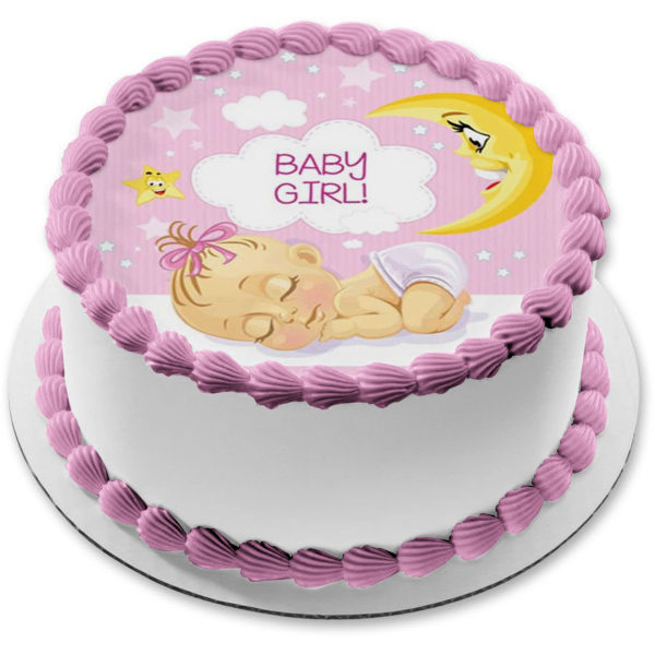 Decorate your Cake with this Baby Girl themed Edible Cake Topper Image featuring a Sleeping Baby Girl with Clouds, Stars and the Moon!