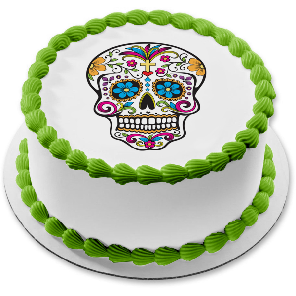 Decorate your Cake with this Cartoon themed Edible Cake Topper Image featuring a Sugar Skull with Flowers, Hearts and a Cross!