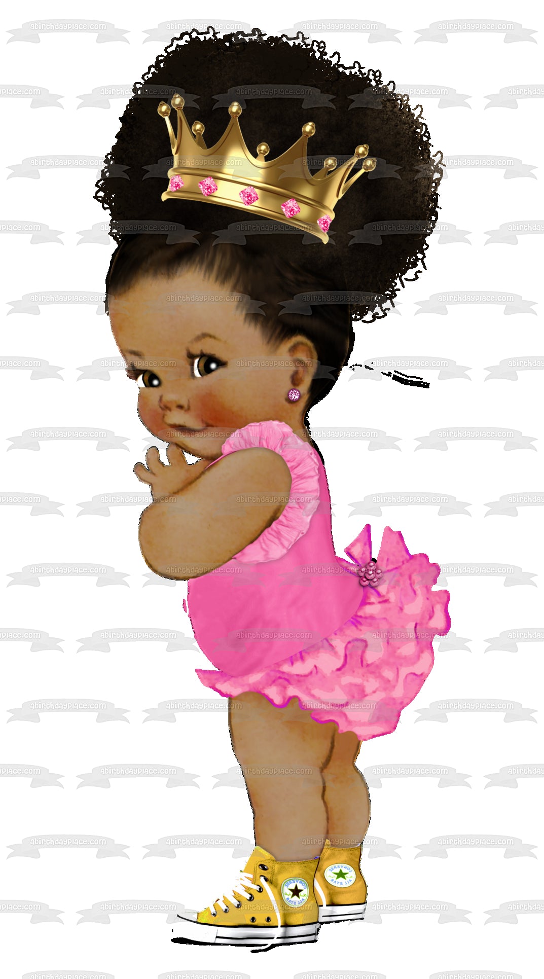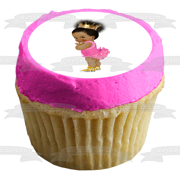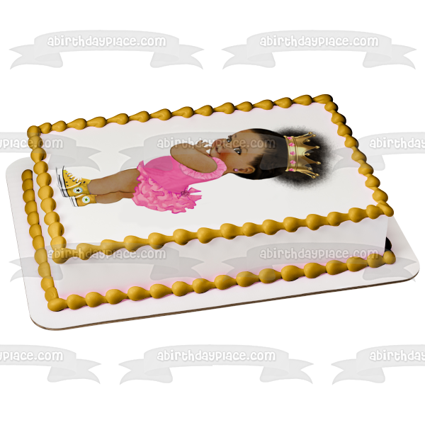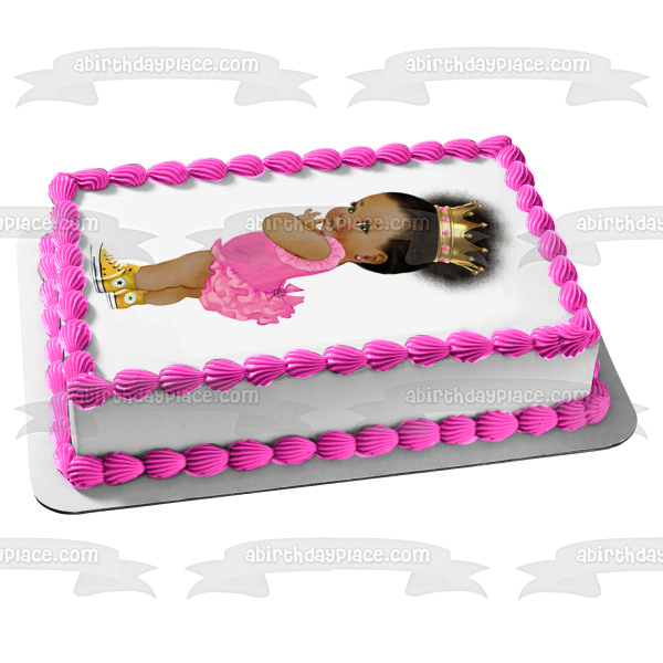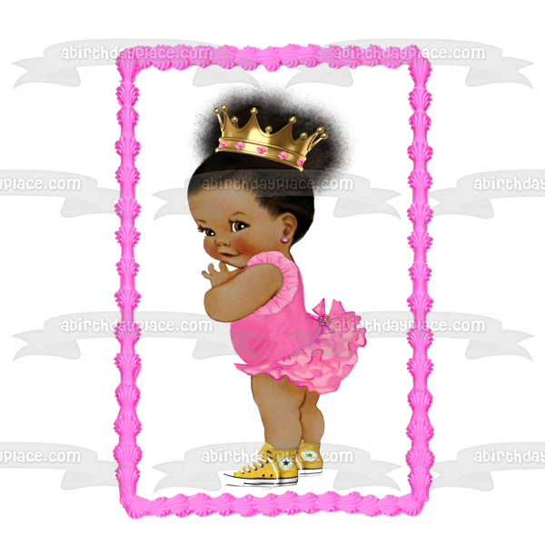 Decorate your Cake with this Baby Girl themed Edible Cake Topper Image featuring an African American Baby Girl wearing a Pink Ballerina Outfit, a Gold Crown and Yellow Converse Sneakers!