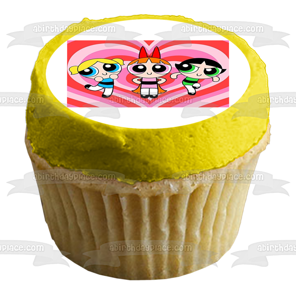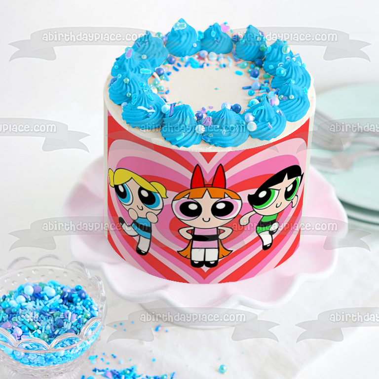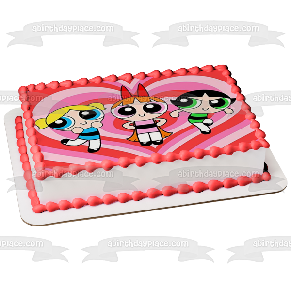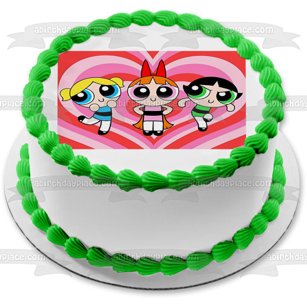 Decorate your Cake with this Power Puff Girls themed Edible Cake Topper Image featuring Blossom, Bubbles and Buttercup with a Hearts Background!