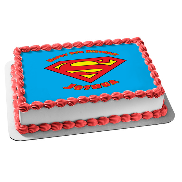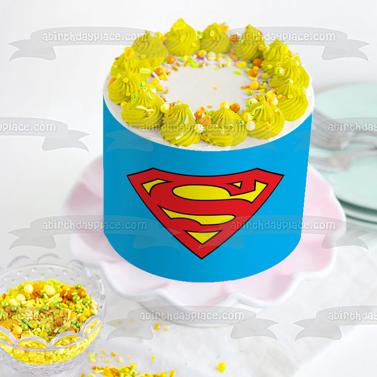 Decorate your Cake with this DC Comics themed Edible Cake Topper Image featuring Supermans Logo with a Blue Background!