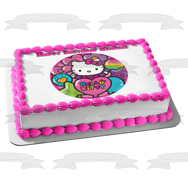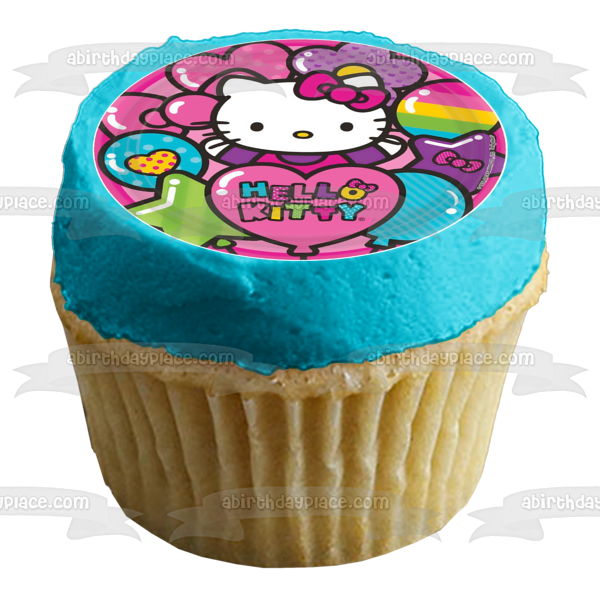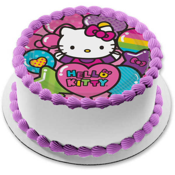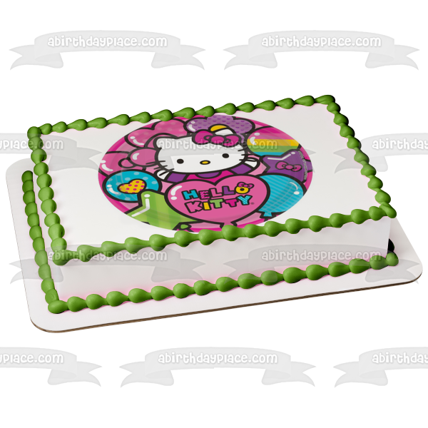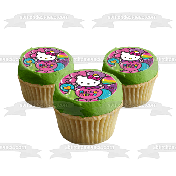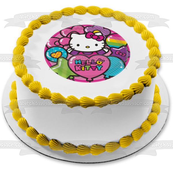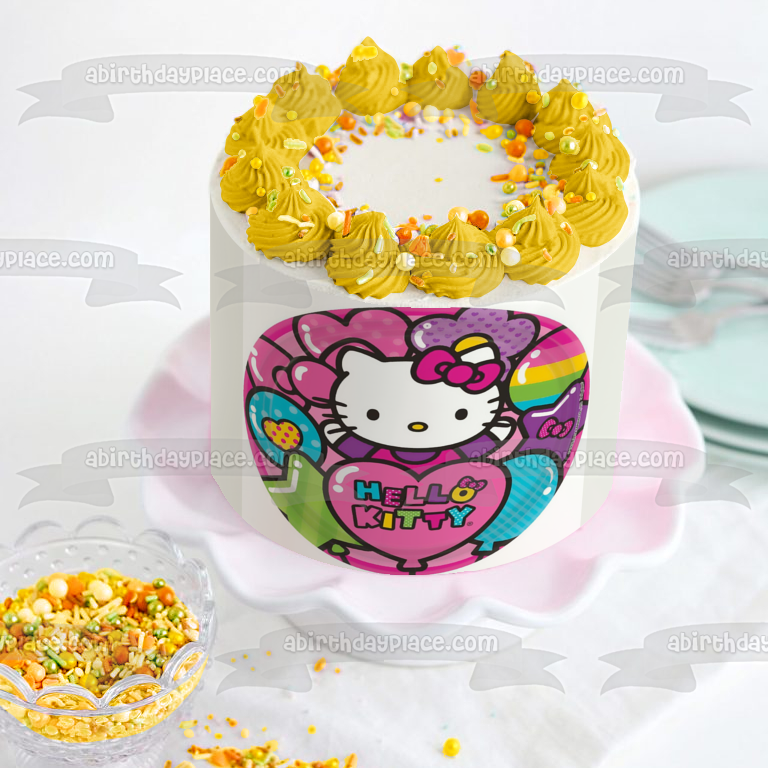 Decorate your Cake with this Hello Kitty themed Edible Cake Topper Image featuring her surrounded by Flower, Heart, and Star Shaped Balloons!