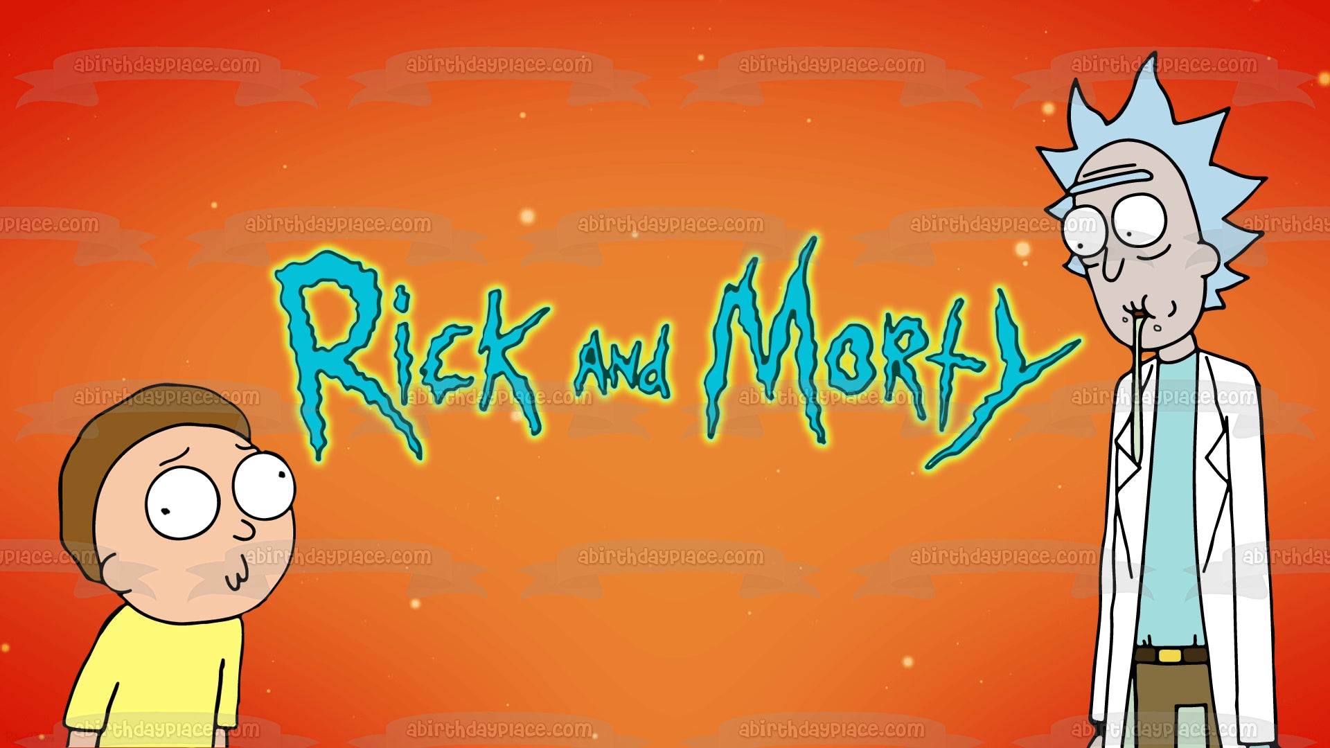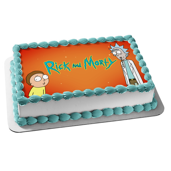 Decorate your Cake with this Rick and Morty themed Edible Cake Topper Image featuring Rick Sanchez and Morty Smith with an Orange Background!