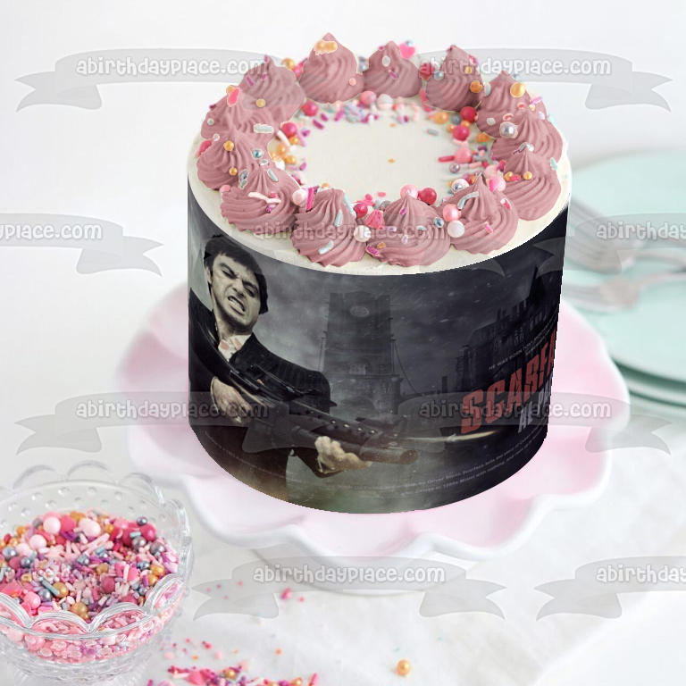 Decorate your Cake with this Scarface themed Edible Cake Topper Image featuring Al Pachino as Tony Montana firing a Machine Gun with City Buildings in the Background!