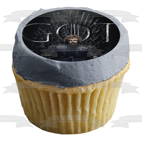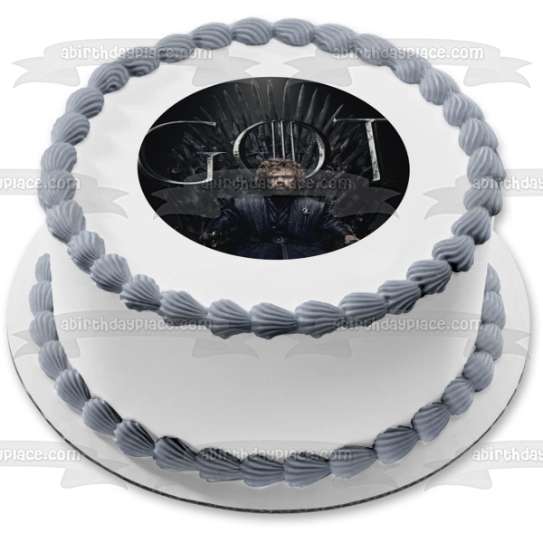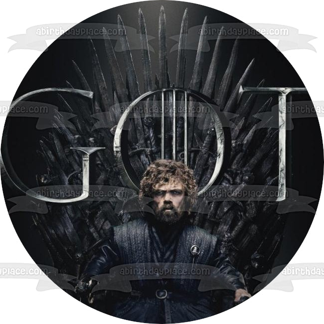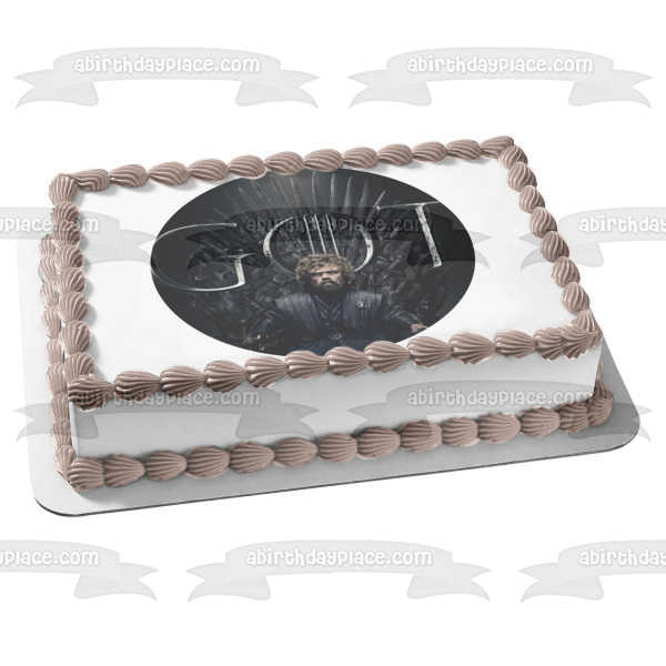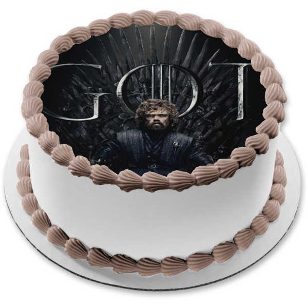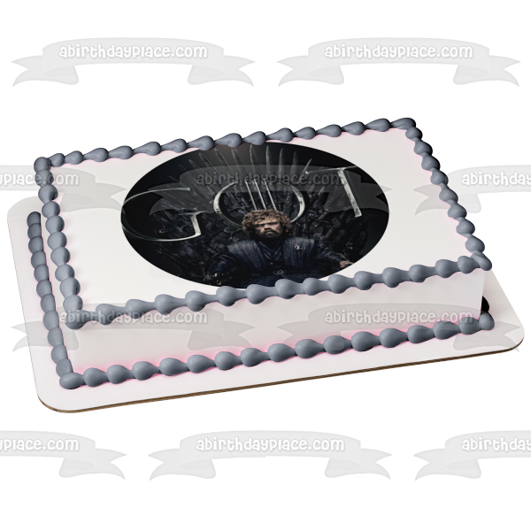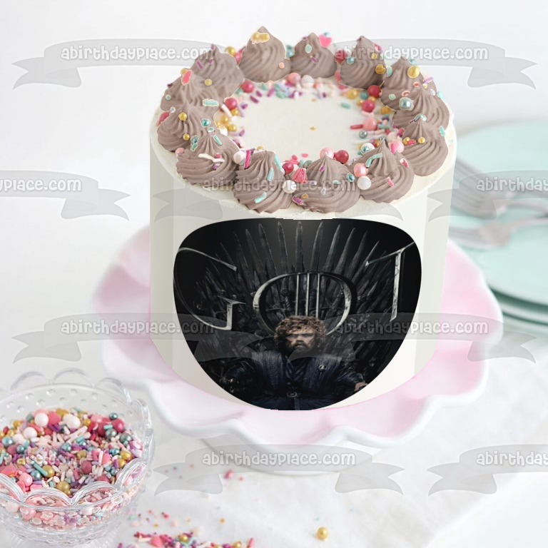 Decorate your Cake with this Game of Thrones themed Edible Cake Topper Image featuring Tyrion Lannister sitting on the Iron Throne with a Black Background!