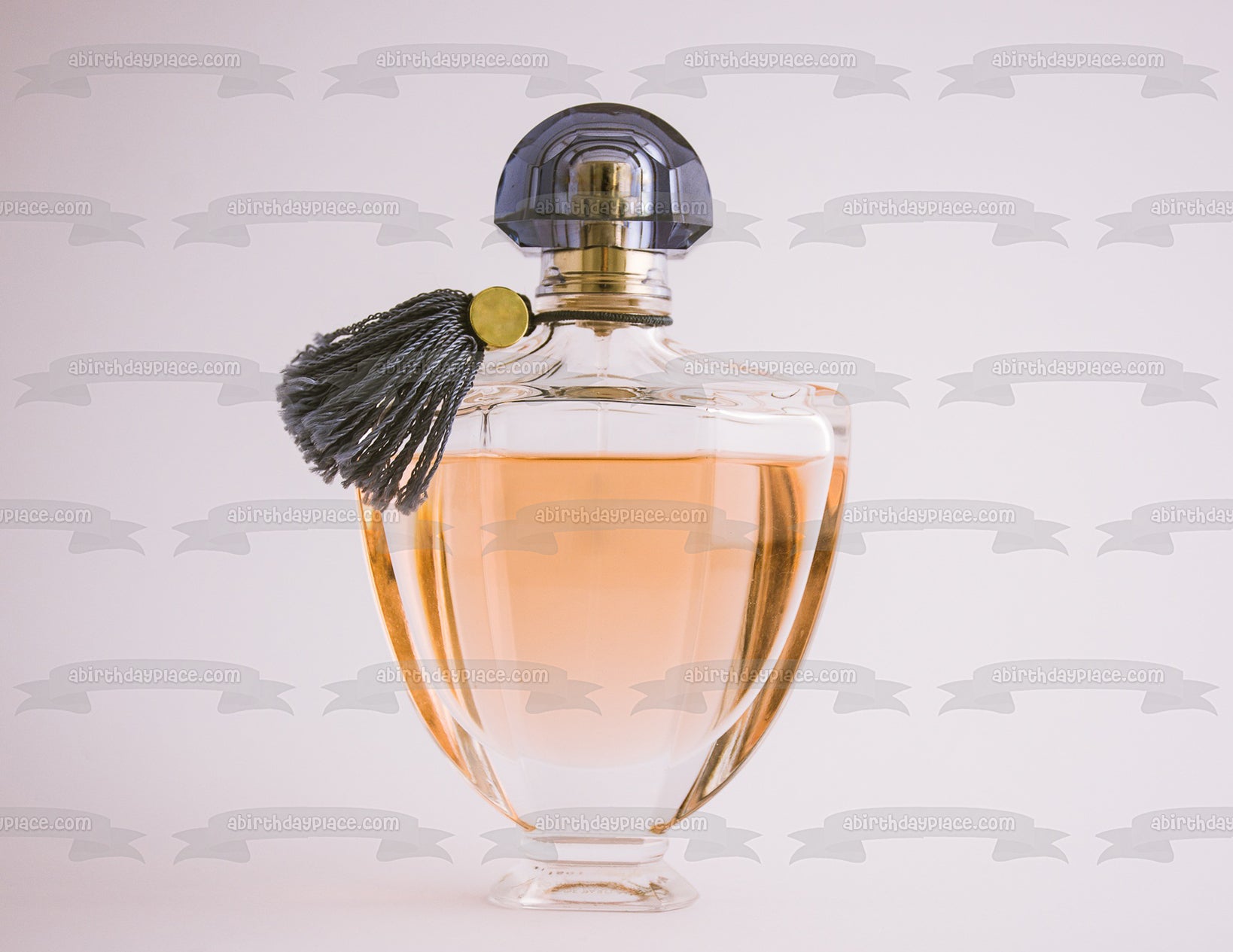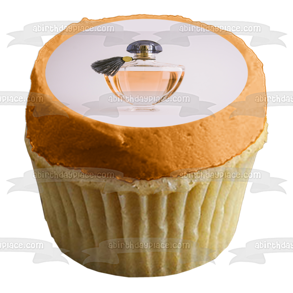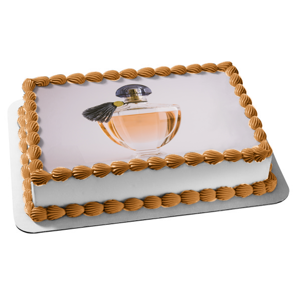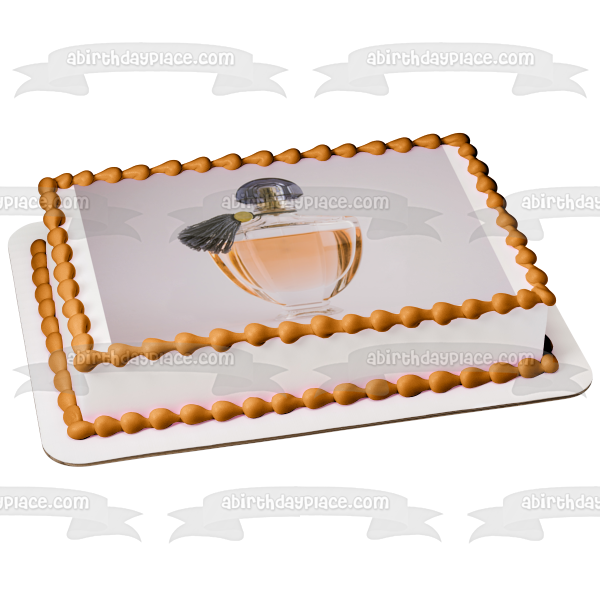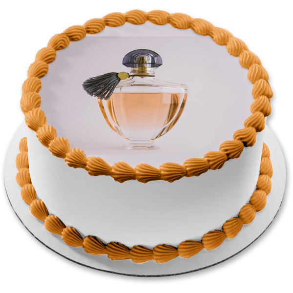 Decorate your Cake with this Perfume Bottle themed Edible Cake Topper Image featuring a Black Cover and Tassle with a White Background!