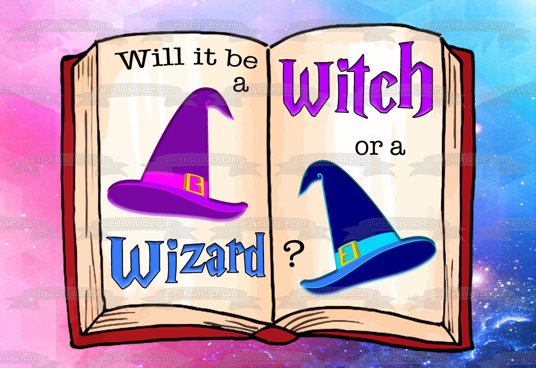 Decorate your Cake with this Baby Shower themed Edible Cake Topper Image featuring a Book saying Will it Be a Witch or a Wizard with Witch and Wizard Hats!