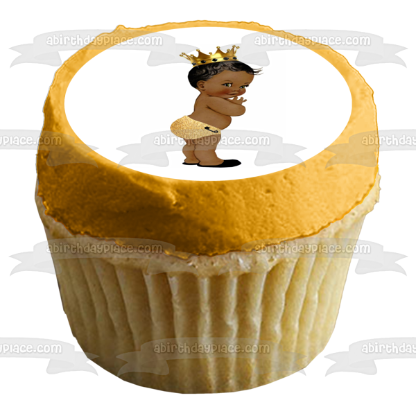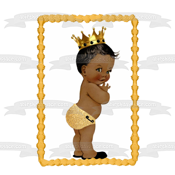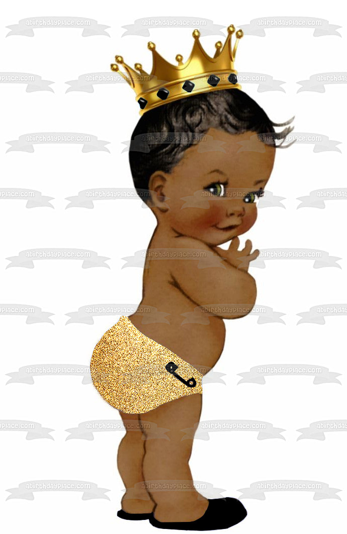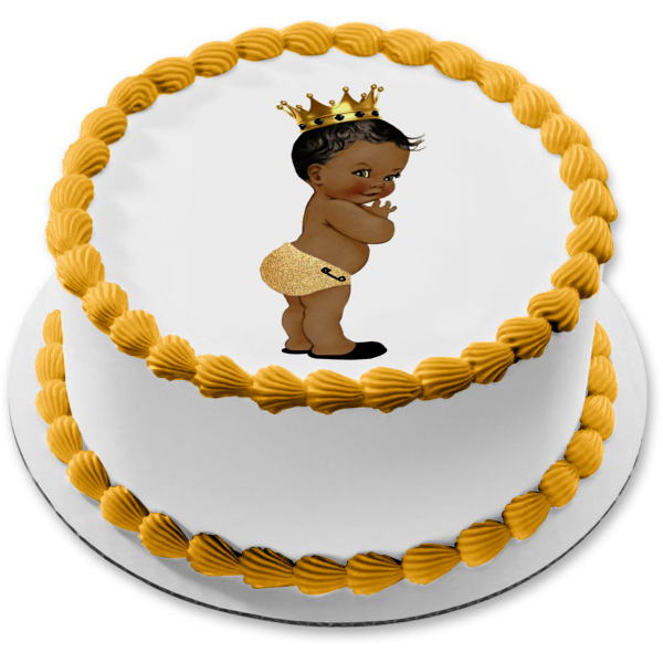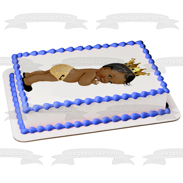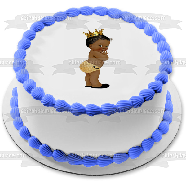 Decorate your Cake with this Baby Shower It's a Boy themed Edible Cake Topper Image featuring a Baby wearing A Gold Crown and Diaper!