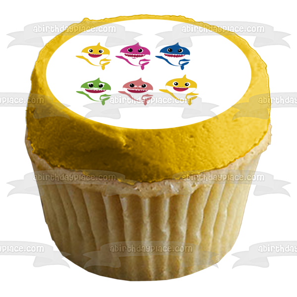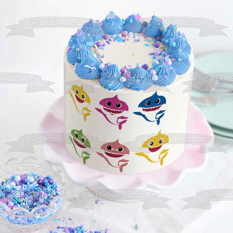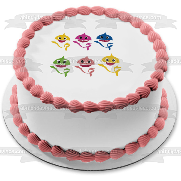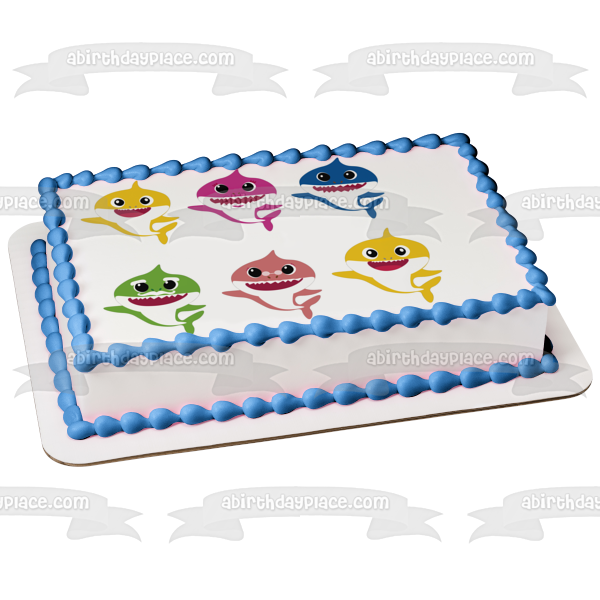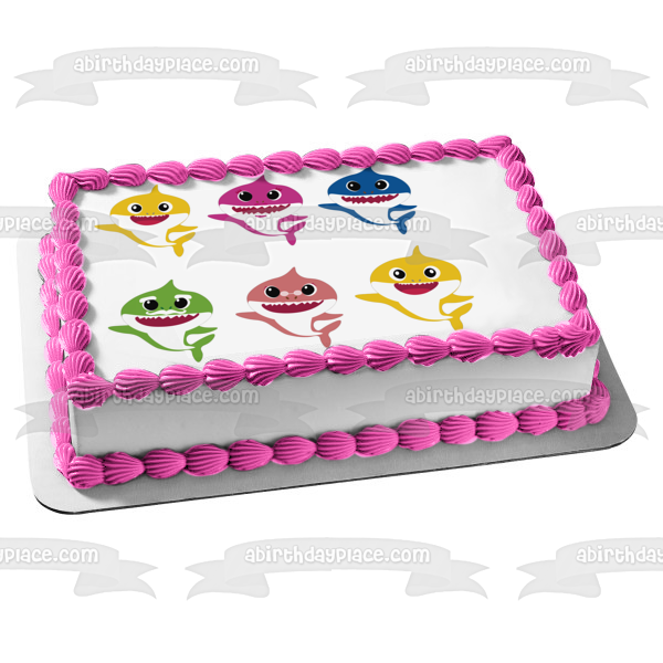 Decorate your Cake with this Cartoon Sharks themed Edible Cake Topper Image featuring Yellow, Blue, Green and Pink Sharks!