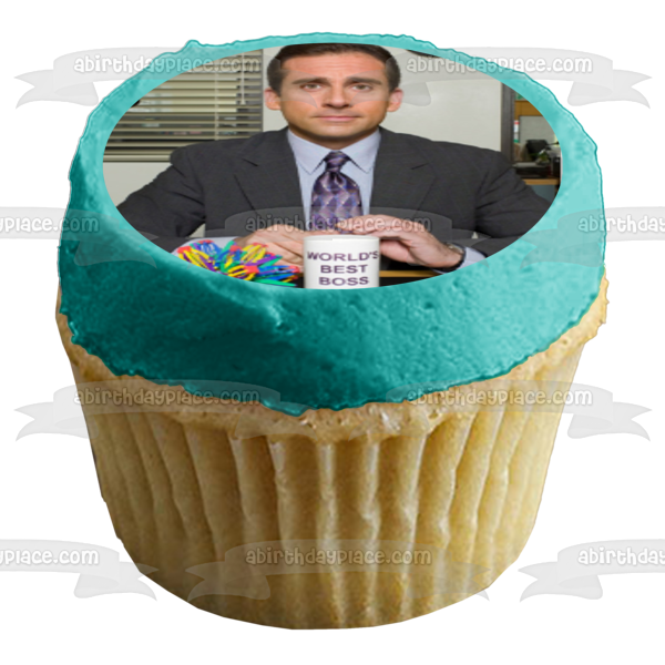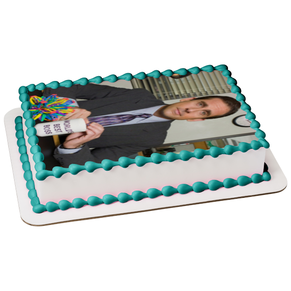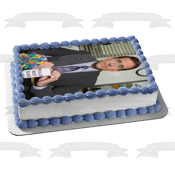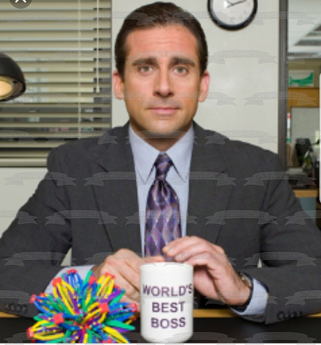 Decorate your Cake with this The Office themed Edible Cake Topper Image featuring Michael Scott with his World's Best Boss Coffee Mug!