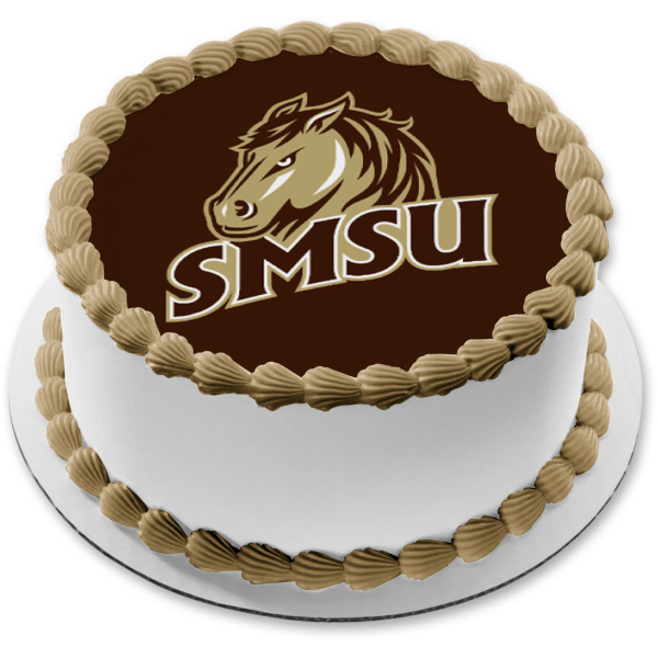Decorate your Cake with this Southwest Minnesota State University themed Edible Cake Topper Image featuring the Mustangs Logo!