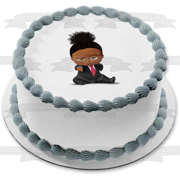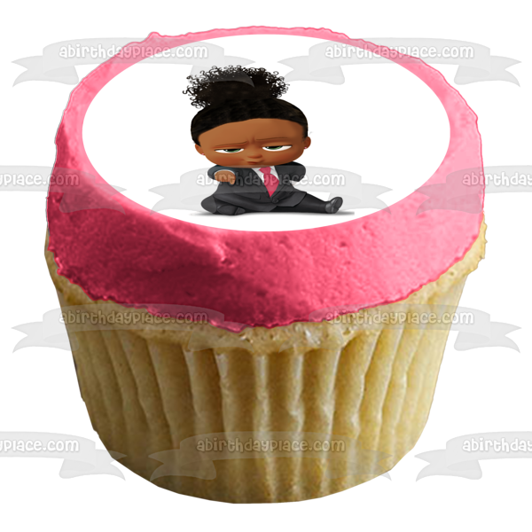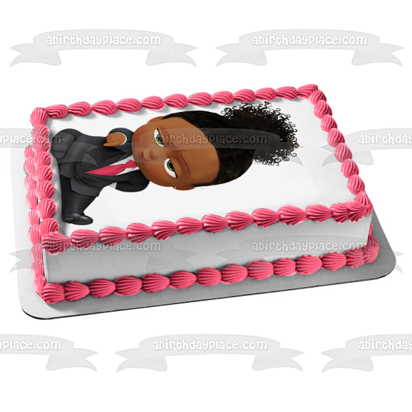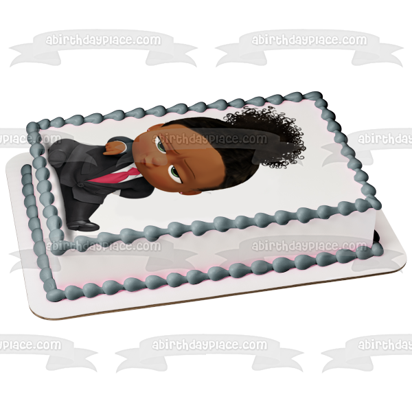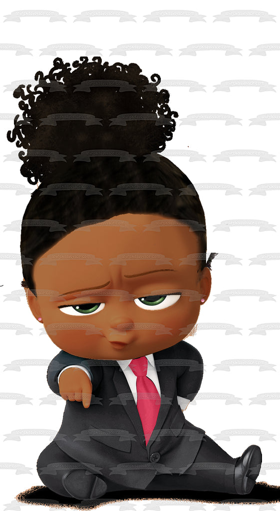 Decorate your Cake with this African American Girl Boss Baby themed Edible Cake Topper Image featuring her Hair in a Ponytail!
