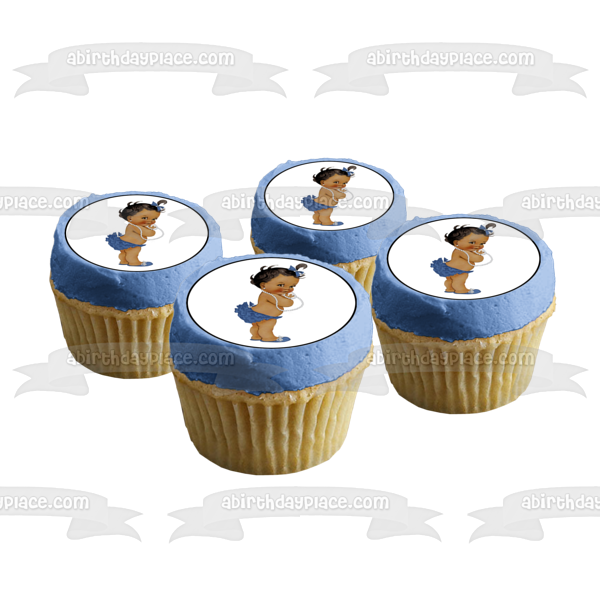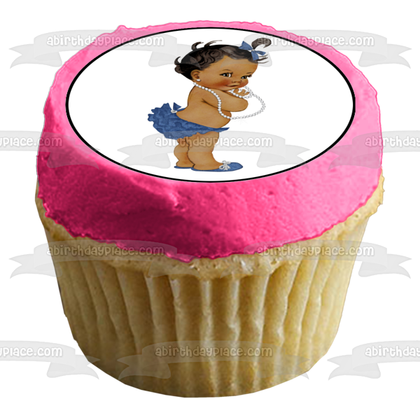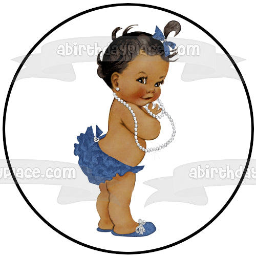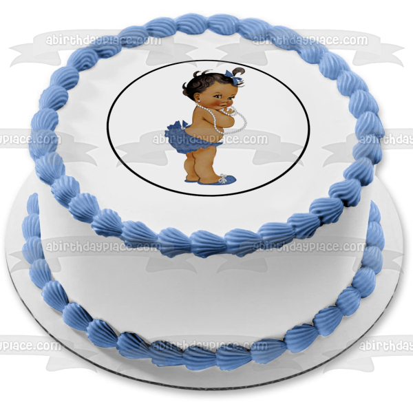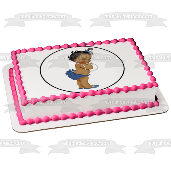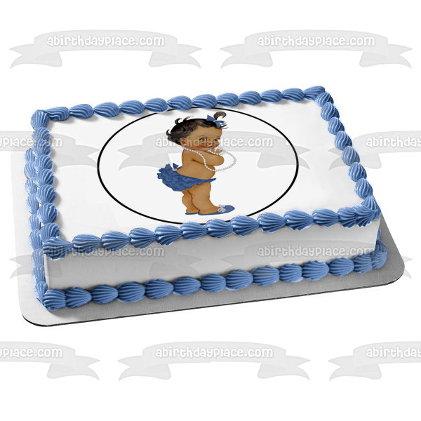 Decorate your Cake with this African American Baby Girl themed Edible Cake Topper Image featuring her with a Blue Hairbow, Bloomers and Shoes with a White Necklace!