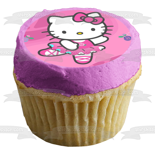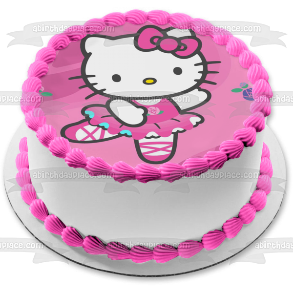 dywt Hello Kitty White themed Edible Cake Topper Image featuring her wearing a Ballerina Outfit with a Pink and Flowers Background!
