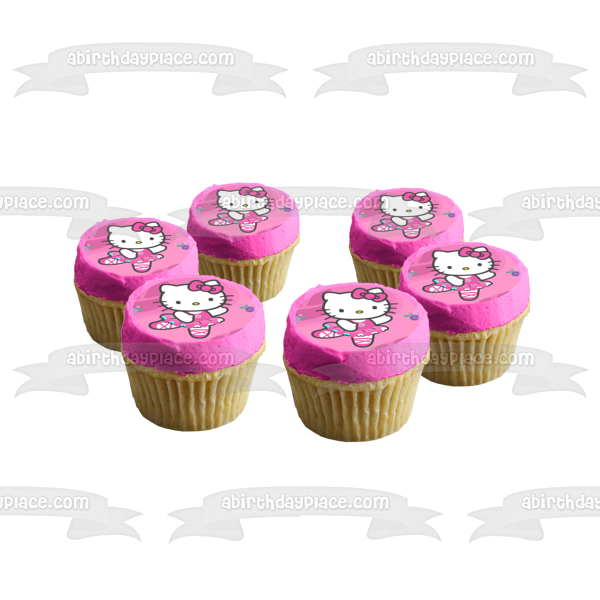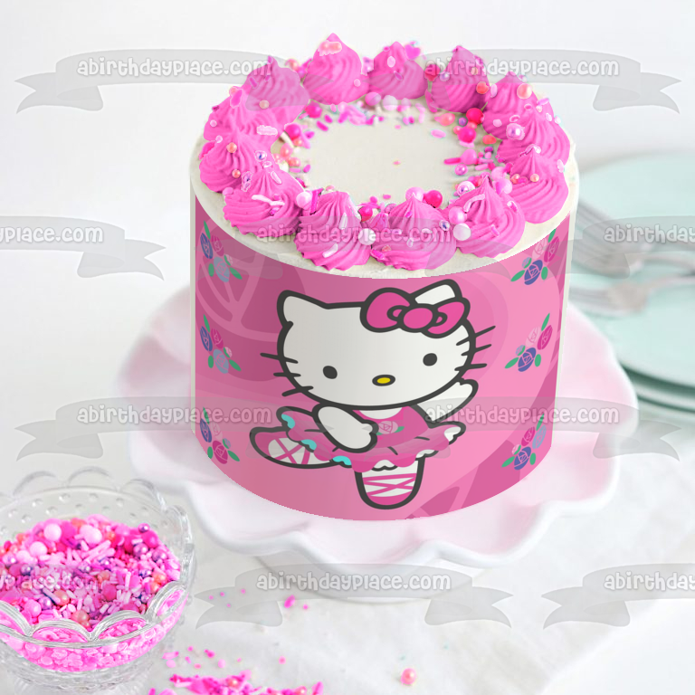 Hello Kitty White Ballerina Outfit Flowers Pink Background Edible Cake Topper Image ABPID27834