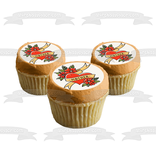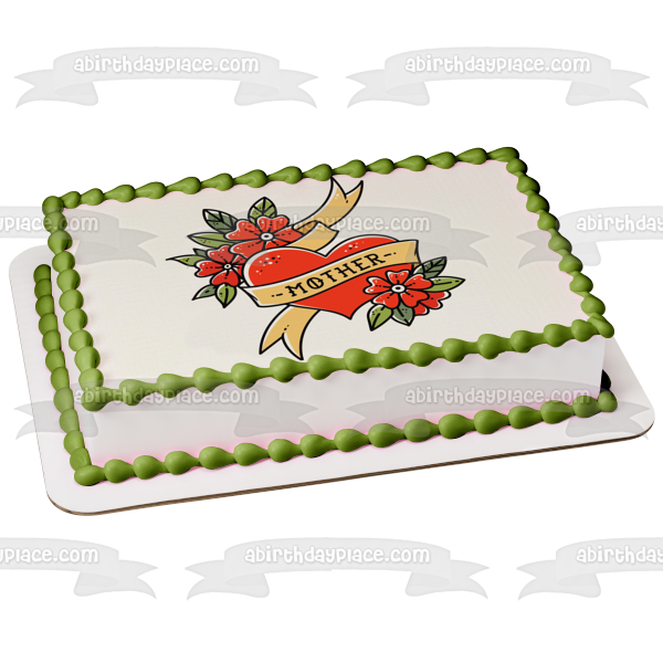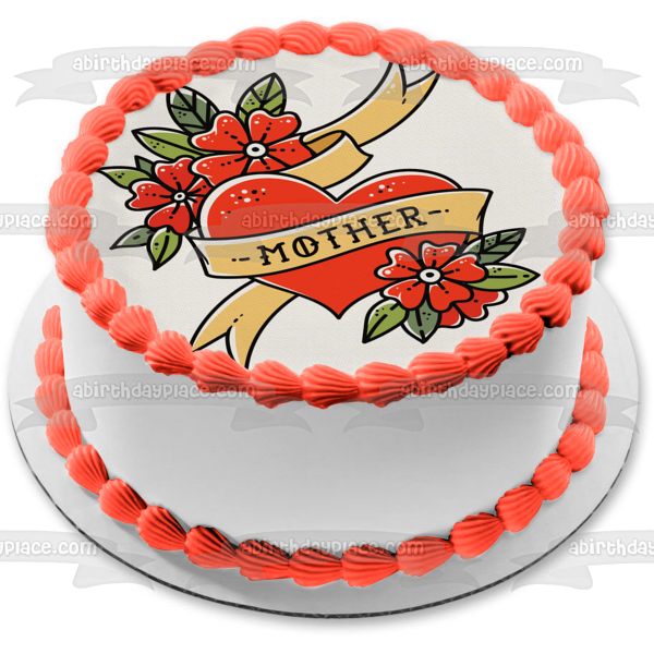 Decorate your Cake with this Mother Tattoo themed Edible Cake Topper Image featuring a Red Heart and Flowers!