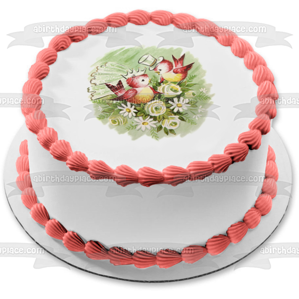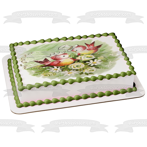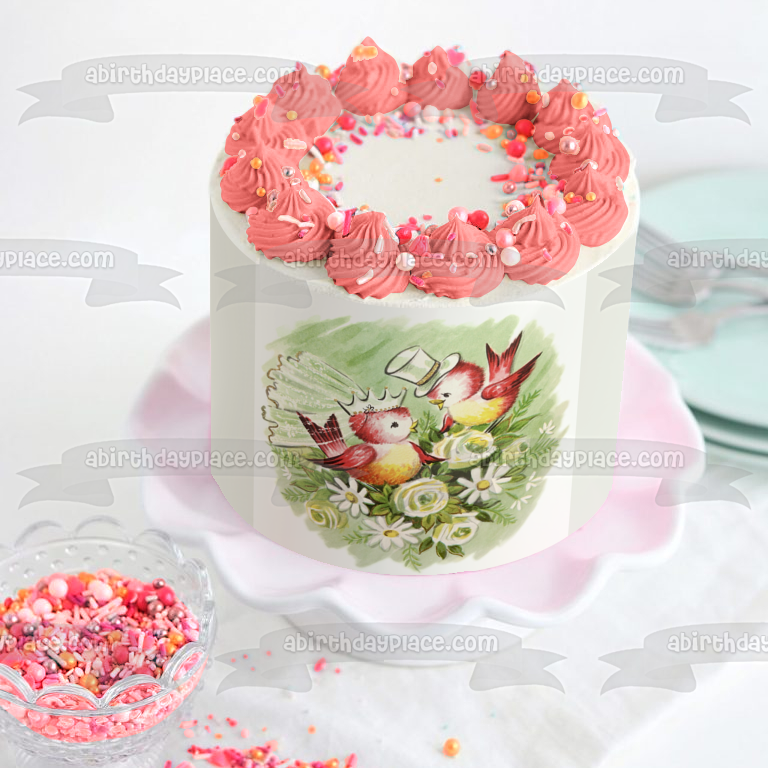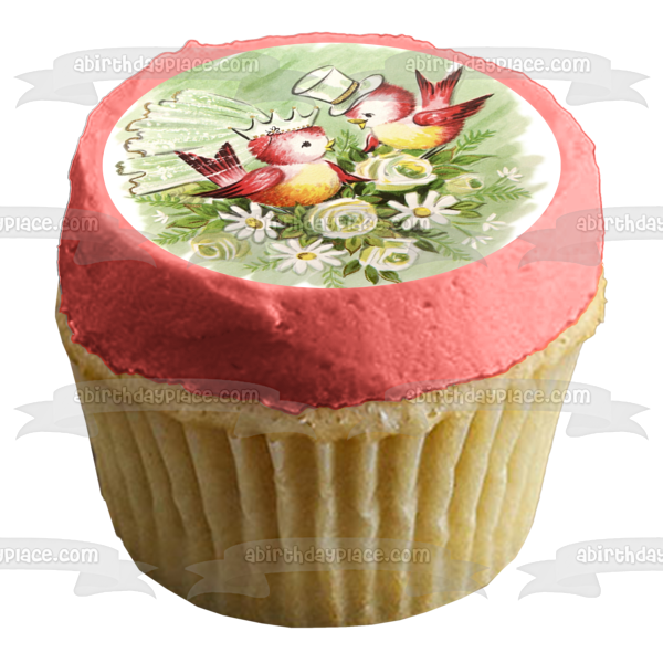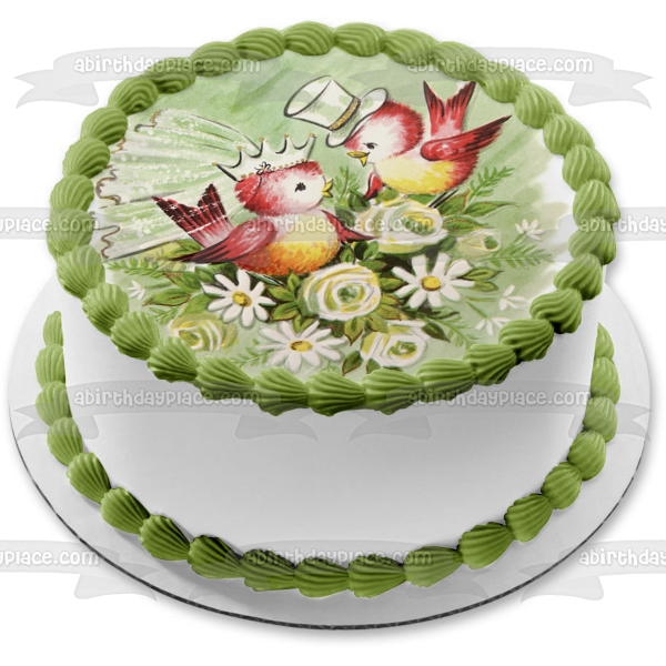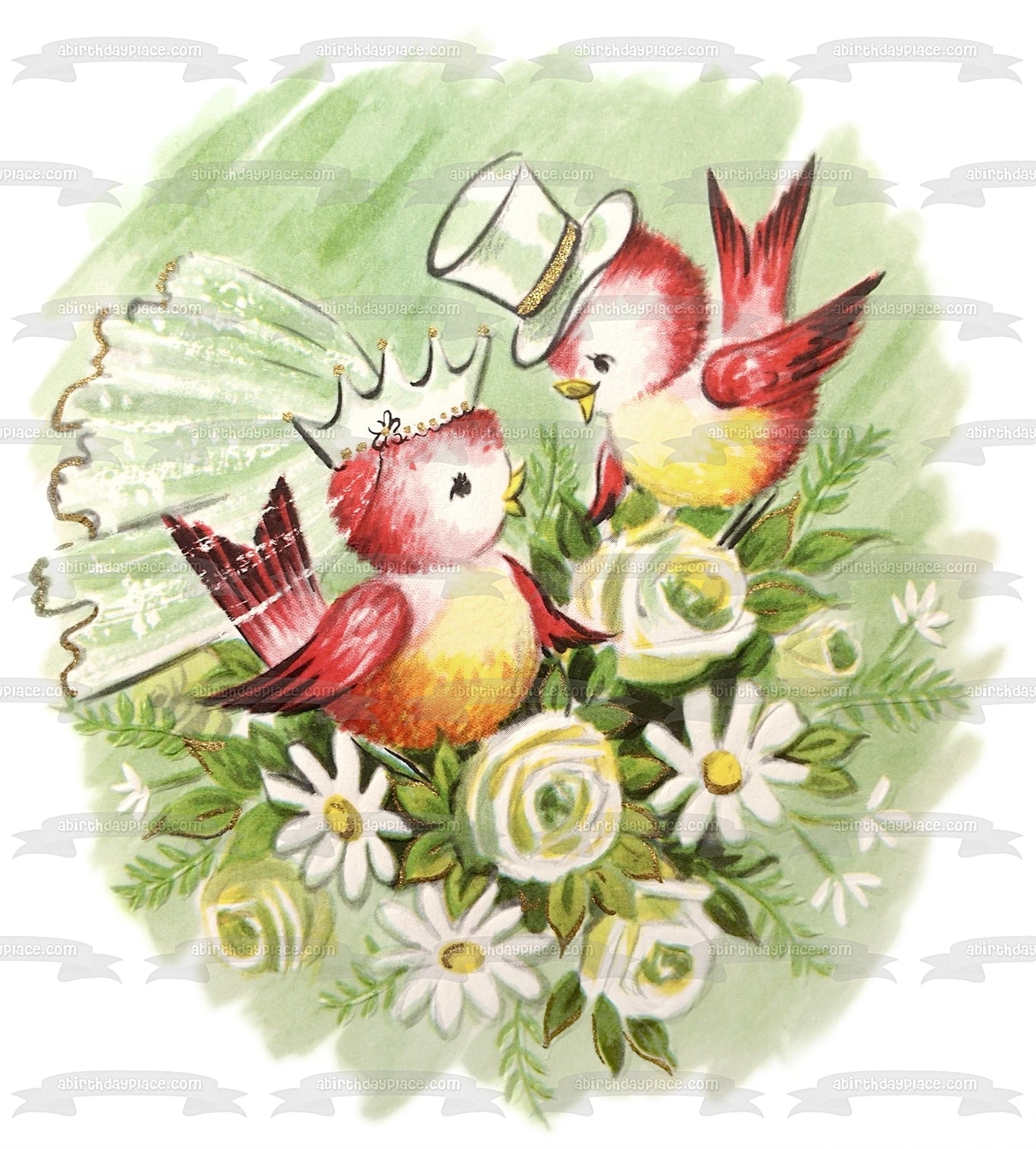 Decorate your Cake with this Wedding themed Edible Cake Topper Image featuring Red Birds as the Bride and Groom surrounded by White Flowers!