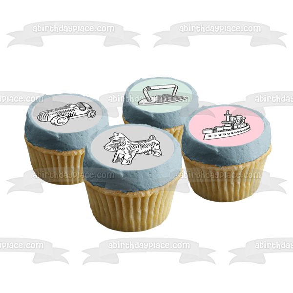 Decorate your Cupcakes with these Monopoly Game Pieces themed Edible Cake Topper Image featuring the Hat, Shoe, Ship, Wheelbarrow, Car, Thimble and Iron!
