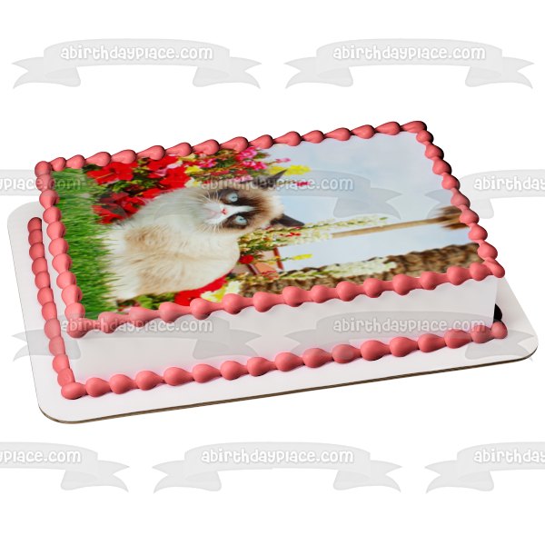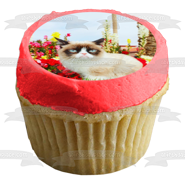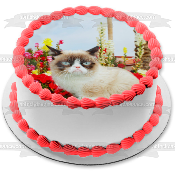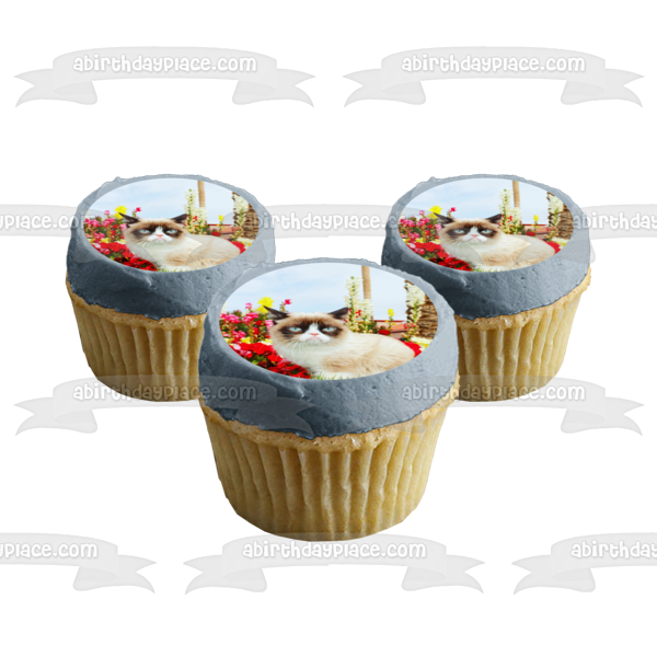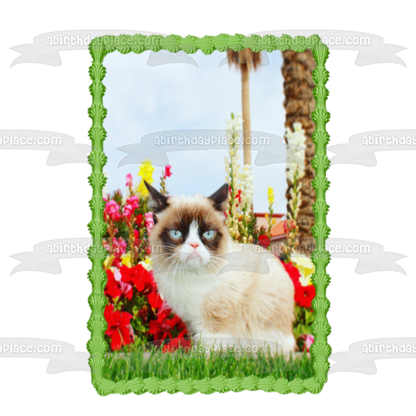 Decorate your Cake with this Grumpy Cat themed Edible Cake Topper Image featuring Flowers and a Sky Background!