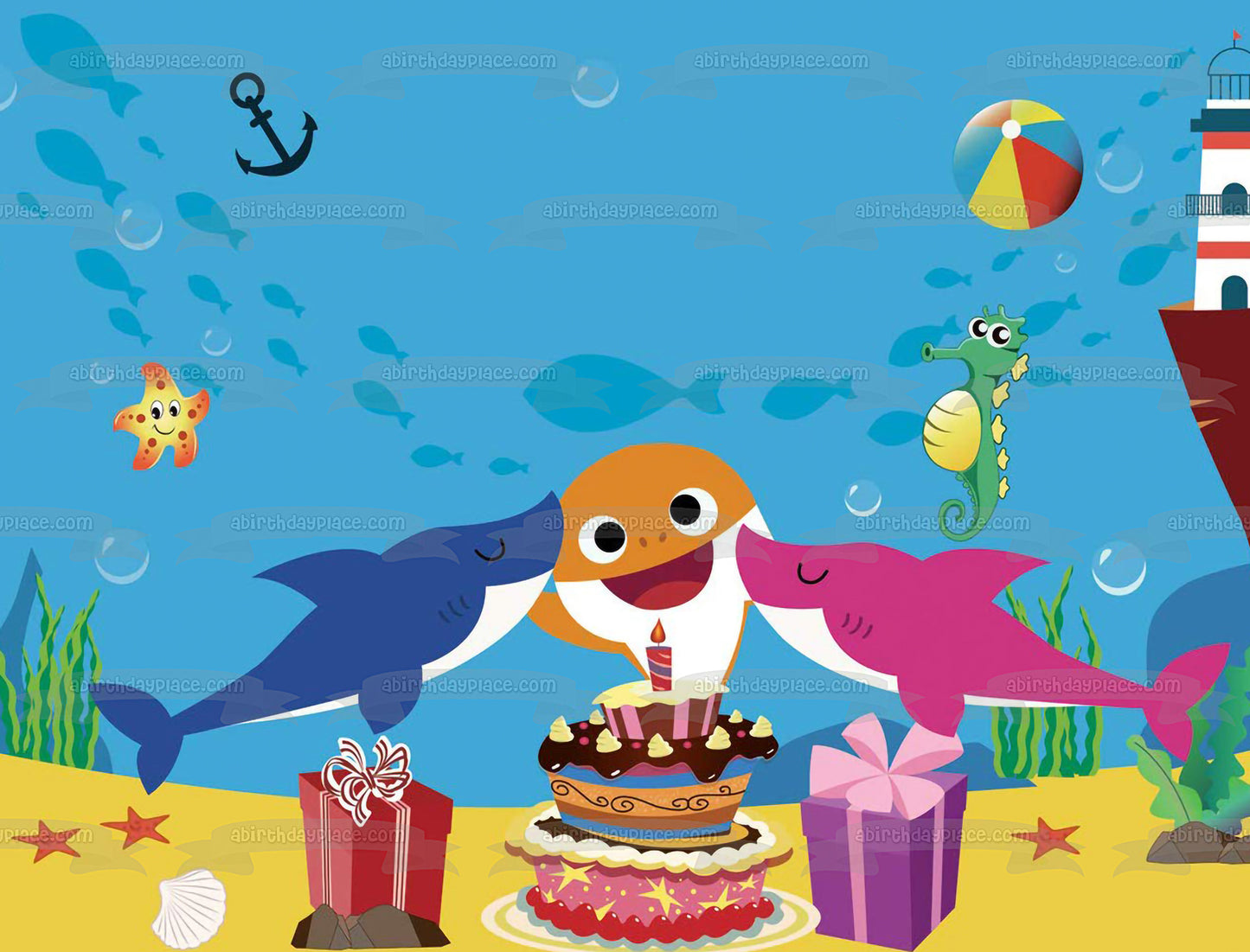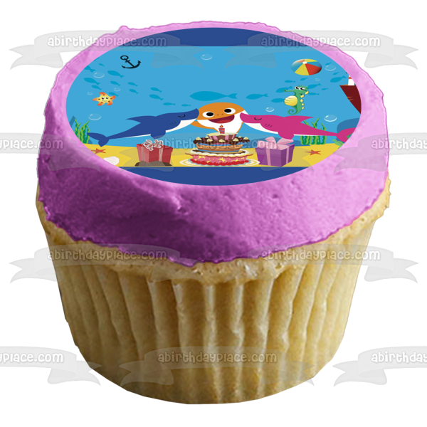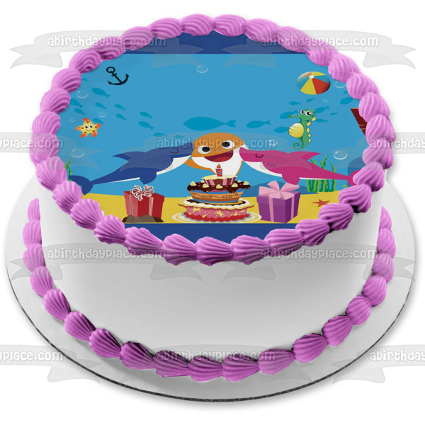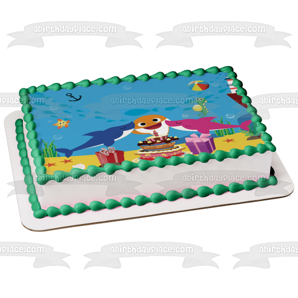 Decorate your Cake with this Baby Shark Happy Birthday themed Edible Cake Topper Image featuring Mommy Shark, Daddy Shark, Presents, a Birthday Cake and a Beach Ball!