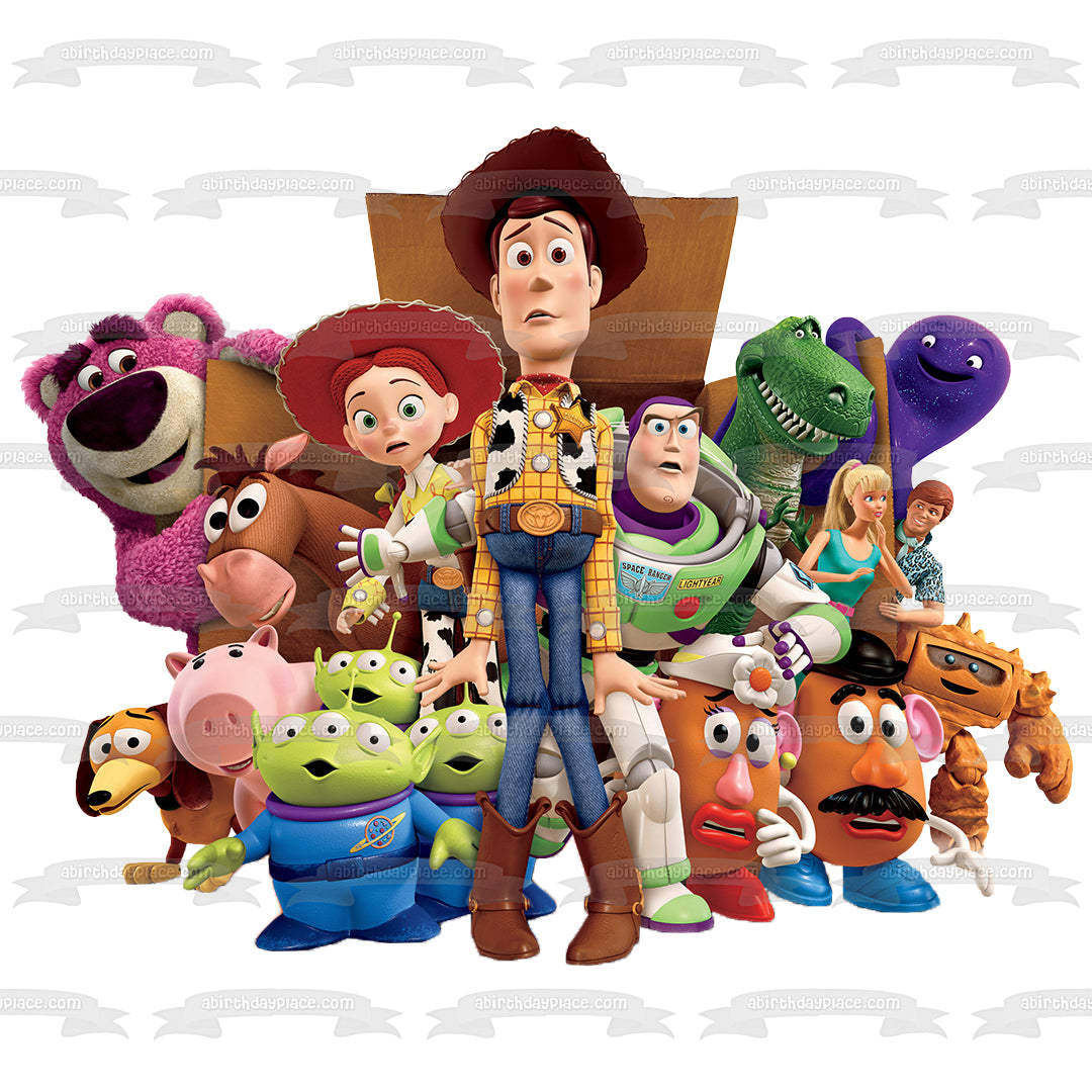 Toy Story Woody Buzz Lightyear Mr. Potato Head Mrs. Potato Head Bo Peep Rex Hamm Edible Cake Topper Image ABPID49915