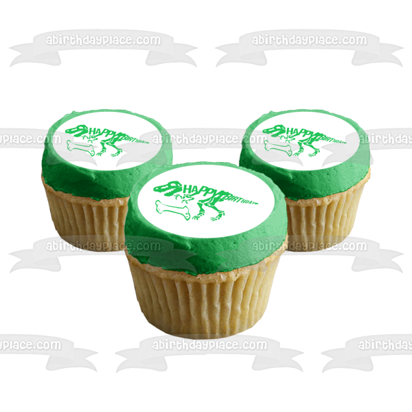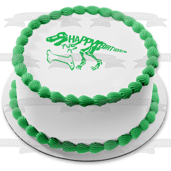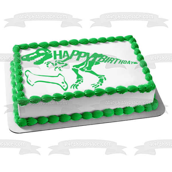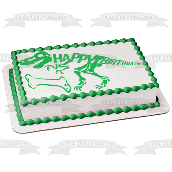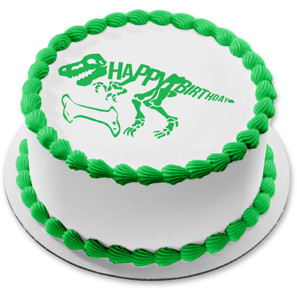 Decorate your Cake with this Green Dinosaur Skeleton themed Edible Cake Topper Image featuring a Green Bone and the words Happy Birthday!