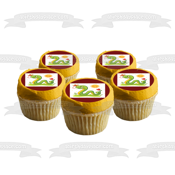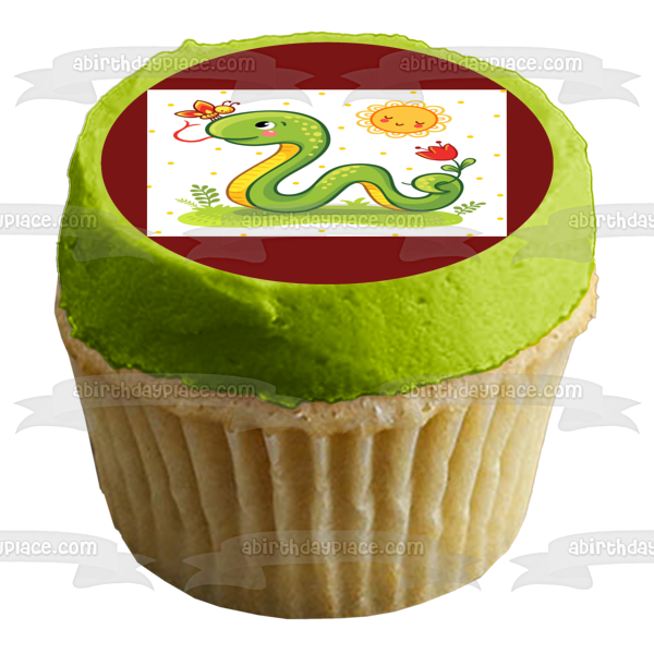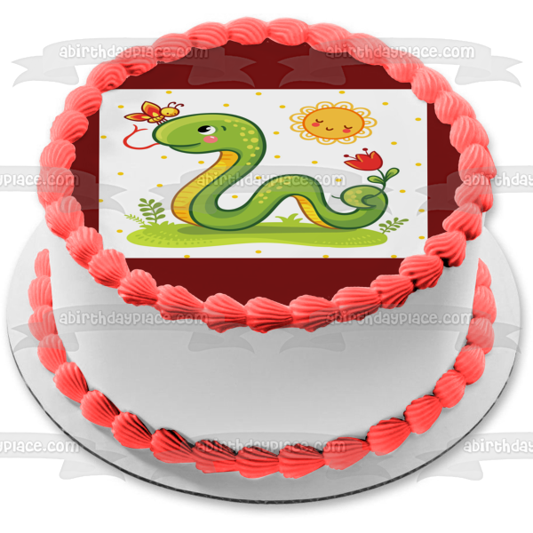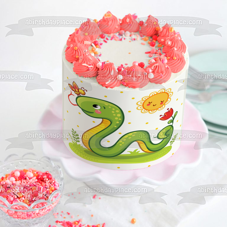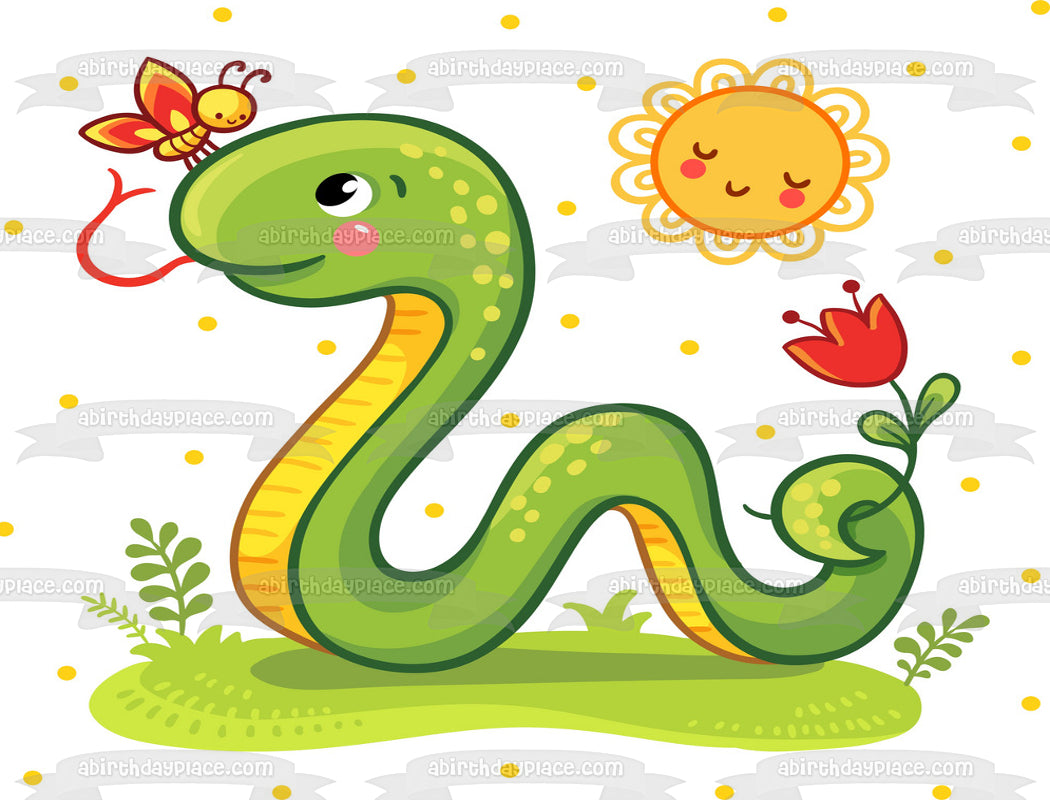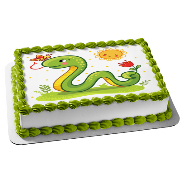 Decorate your Cake with this Cartoon Snake themed Edible Cake Topper Image featuring him on the Grass with a Flower, Butterfly and the Sun!