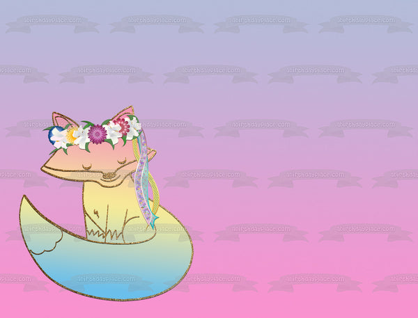 Decorate your Cake with this Pastel Glitter Fox themed Edible Cake Topper Image featuring her Wearing a Flower Crown with a Pink and Purple Background!