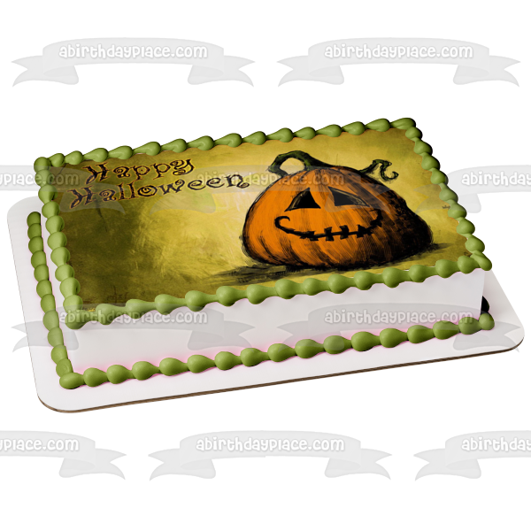 Decorate your Cake with this Halloween themed Edible Cake Topper Image featuring a Jack-O-Lantern Pumpkin alongside the words "Happy Halloween"!