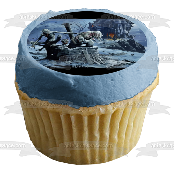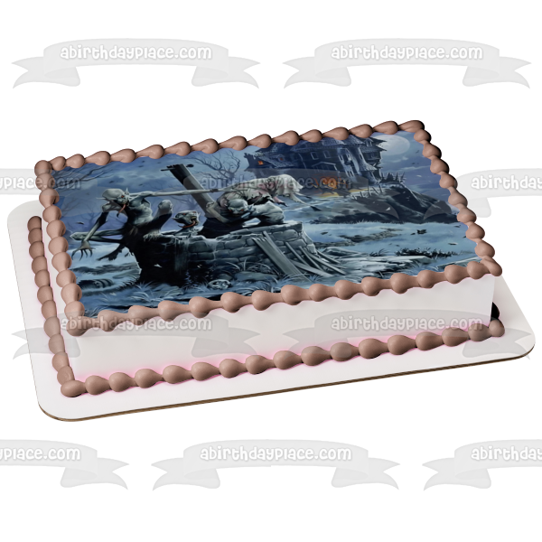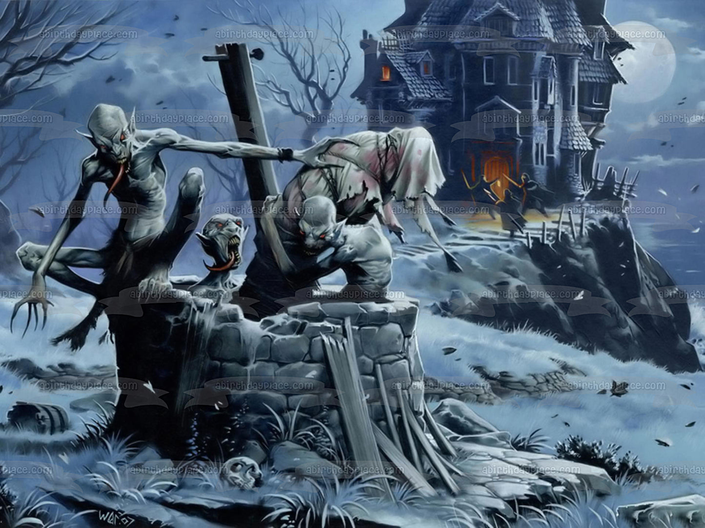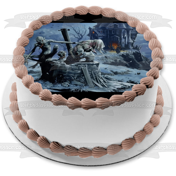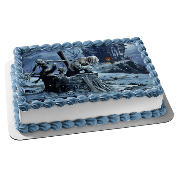 Decorate your Cake with this Halloween themed Edible Cake Topper Image featuring Scary Monster and Demons climbing out of a well in front of a Haunted House!