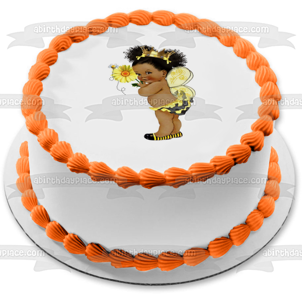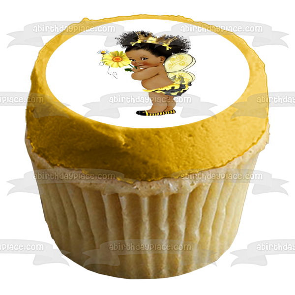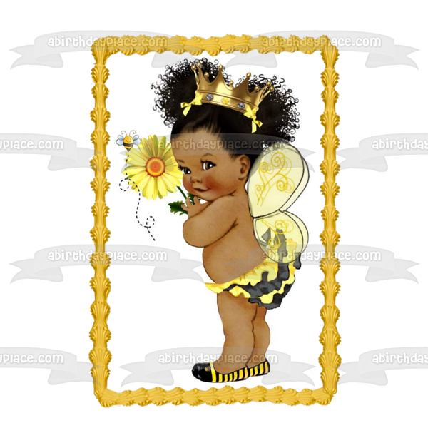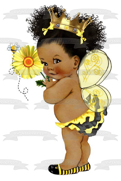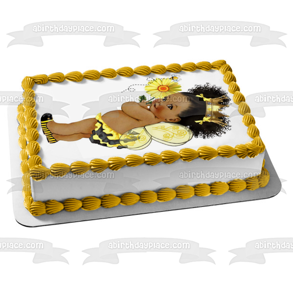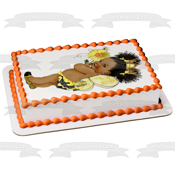 Decorate your Cake with this Baby Shower themed Edible Cake Topper Image featuring an African American Princess with a King Crown and a Bee Outfit!